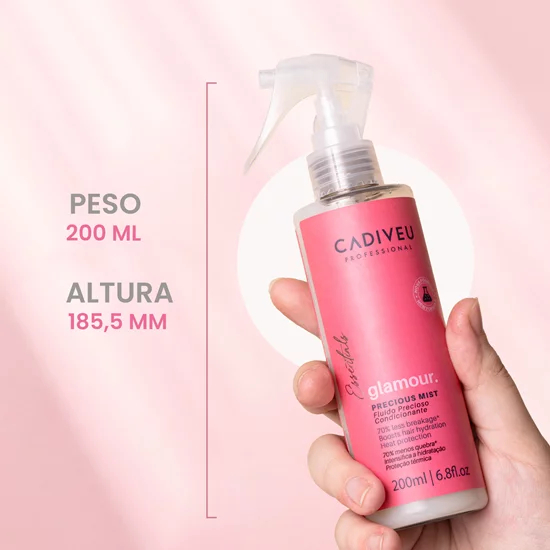 Cadiveu Professional Glamour Rubi Fluido Precioso Poderoso fluido em spray com ação anti-frizz para todos os tipos de cabelos. Ultraleve, Cadiveu Professional Glamour Rubi Fluido Precioso disciplina e proporciona brilho extra. Cadiveu Professional Glamour Rubi Fluido Precioso sela as cutículas dos fios e elimina o frizz de forma eficaz e duradoura. Melhora o toque, aumenta a disciplina e nutre para deixar os cabelos mais fortes e sedosos. Assim, finaliza o penteado com perfeição. Ação Micropartículas de Rubi: selam os fios formando uma barreira protetora que protege os cabelos contra as agressões ambientais e mecânicas, como uso de secador e chapinha. Promove um brilho intenso e duradouro, devido a sua cintilância natural. Cisteína: responsável pela recuperação dos fios, regenera-os desde seu interior.