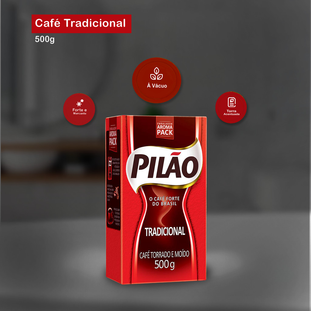 Café a Vácuo Tradicional 500g Pilão O Café Pilão Tradicional tem um ponto de torra acentuado e um processo de moagem fina e uniforme, que garantem e preservam seu sabor forte e encorpado. É perfeito para o seu dia a dia. Produzido com grãos selecionados, entrega uma bebida consistente, com personalidade e o sabor característico que consagrou a marca Pilão. Indicação de Uso: - Ideal para preparo em filtro de papel, coador de pano ou cafeteiras elétricas, atendendo tanto ao consumo diário em residências quanto ao uso profissional em padarias, escritórios, bares e restaurantes. Intensidade: 08 Aroma: Forte Moagem: Fina Embalagem: 01 pacote de 500g