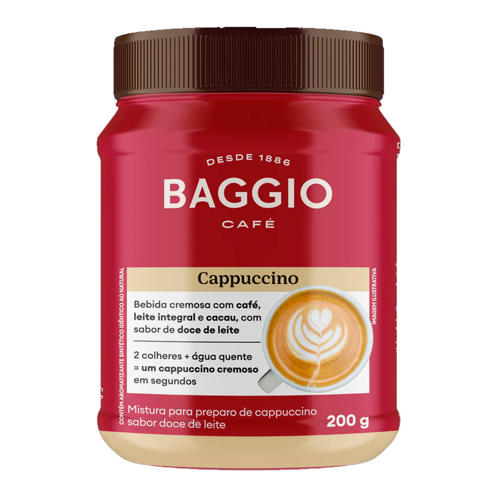 VOCÊ ESTÁ COMPRANDO: Café Baggio Cappuccino pote 200 g — mistura instantânea para preparo de cappuccino. SOBRE O PRODUTO: Peso: 200 g Marca: Baggio (linha Cappuccino) Tipo: Mistura instantânea pronta para preparo de bebida cappuccino com aroma e sabor característicos. COMPOSIÇÃO (ver rótulo para dados exatos): Mistura de café instantâneo, achocolatado/cacau, açúcar e ingredientes lácteos em pó ou substitutos, além de aromatizantes (variações conforme versão). Consulte o rótulo para ingredientes, presença de glúten e alérgenos (leite, soja etc.). PERFIL DE SABOR: Sabor cremoso e doce com notas de café e chocolate, adequado para quem gosta de bebidas prontas e práticas. EMBALAGEM E CONSERVAÇÃO: Embalagem: pote 200 g com tampa. Conservar em local seco, fresco e ao abrigo da luz. Após aberto, manter o pote bem fechado e consumir preferencialmente conforme data de validade. SUGESTÃO DE PREPARO: Geralmente 2–3 colheres (sopa) por 200 mL de água quente ou leite quente; mexer até dissolver. Ajustar quantidade conforme preferência por intensidade e cremosidade. INDICAÇÕES: Bebida instantânea para consumo quente (ou gelado, conforme gosto). Consulte o rótulo para informações nutricionais e instruções detalhadas.