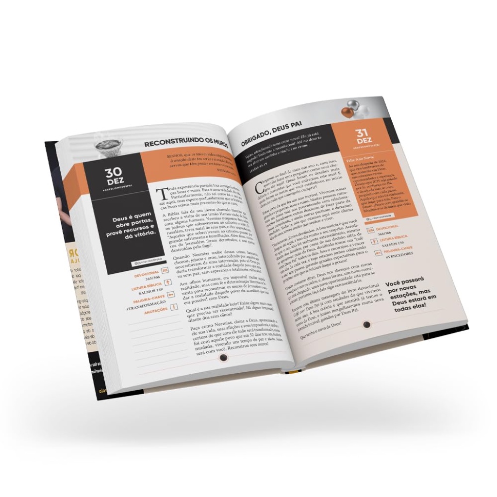 CAFÉ COM DEUS PAI 2024 PORÇÕES DIÁRIAS DE PAZ Que tal desfrutar de um momento íntimo com alguém que te ama e tem as respostas para todas as suas aflições? Essa é a experiência que você encontra em cada página de Café com Deus Pai. São 366 mensagens que te levarão a uma jornada com devocionais diários ao longo do ano, onde você é convidado a ter um encontro com Deus Pai. As páginas interativas irão envolvê lo ainda mais nessa jornada, permitindo que você reflita, anote suas inspirações e compartilhe suas experiências. A cada dia, você encontrará uma mensagem única e significativa, especialmente selecionada para nutrir sua alma e fortalecer sua fé. Para tornar o seu dia ainda mais especial, frases inspiradoras são destacadas ao longo do livro, proporcionando motivação e encorajamento sempre que precisar. E para aqueles que desejam se aprofundar ainda mais na Palavra de Deus, também é incluso um plano de leitura bíblica, que o guiará por uma jornada de conhecimento e descoberta. Além de proporcionar um novo modo de apreciar uma xícara de café, este livro mostrará como a vida pode ser saboreada. Sim, Deus Pai deseja tomar café com você. Soft Touch Toque macio Cheiro de Café Marca páginas de presente dentro do livro Páginas interativas Uma mensagem para cada dia do ano Frases em destaque para inspirar seu dia Plano de leitura bíblica. Informações Adicionais Autor: JÚNIOR, ROSTIROLA Data Publicação: 01/01/1900 Tipo de capa: BROCHURA Condição do Item: Novo Subtitulo: CAFÉ COM DEUS PAI 2024 PORÇÕES DIÁRIAS DE PAZ Idioma: INDEFINIDO Páginas: 424 Edição: 1 ISBN-13: 9786598078805 ISBN-10: 6598078806