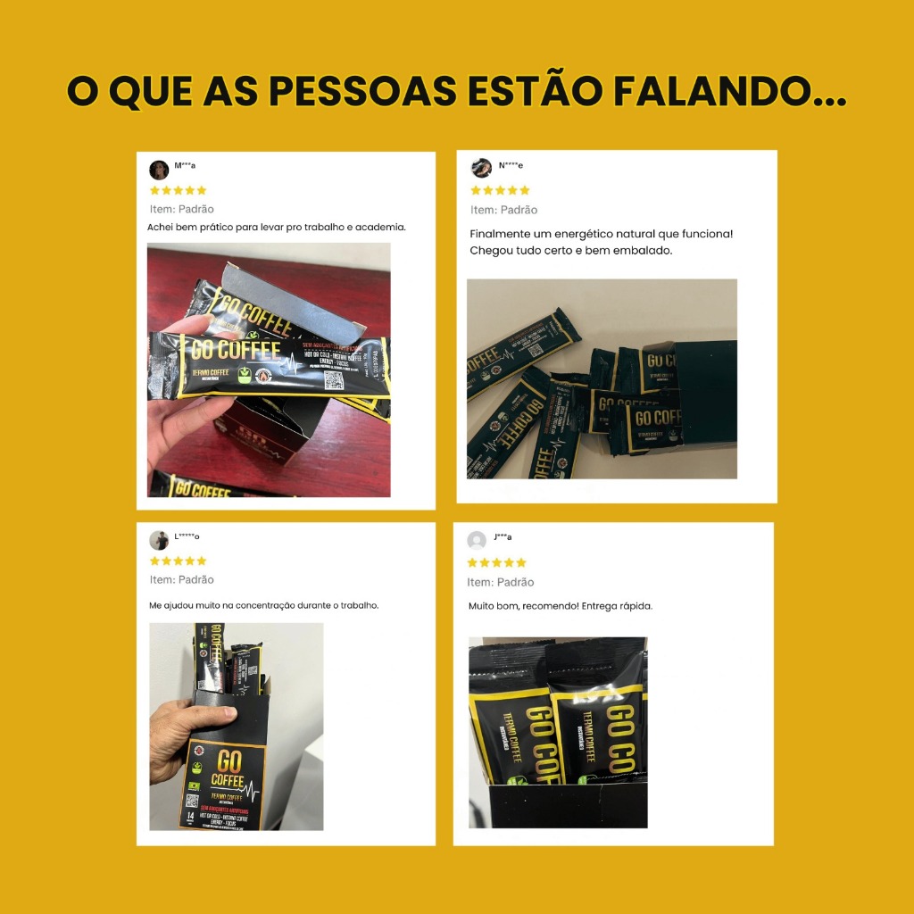 O Go coffee é uma bebida instantânea, adoçada naturalmente com a fibra de maçã e que será seu maior aliado em momentos desafiadores. Conta com um blend de ingredientes energéticos, ricos em vitaminas e antioxidantes; Como o café solúvel, café verde, chocolate amargo em pó 54%, cacau em pó, triglicerídeos, maça em pó, guaraná, pimenta verde, canela, cúrcuma, cogumelo e chá verde. O Go Coffee pode trazer benefícios com a presença de TCM, que é o principal veículo de absorção da cafeína e antioxidantes, otimizando o efeito e duração. Por sua riqueza nos ingredientes pode melhorar também níveis de colesterol, glicemia e trazer a sensação de prazer e bem-estar. Como Consumir? Como preparar o Go Coffee: Adicione 10g (1 Sachê) em 100ml de água quente ou fria e mexa até a diluição completa. Contraindicação Pessoas com hipertensão, sensíveis ou alérgicas aos componentes presentes neste suplemento. Recomendações Armazene em um local fresco, sem contato com a luz e calor. Uso adulto igual ou maior de 19 anos. Consulte um médico ou nutricionista.