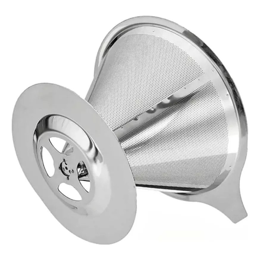 Coador de Café em Aço Inox Tamanho 104 – Não precisa de papel O Coador de café em aço inox auxilia no preparo do café sem o desperdício do preparo comum, e sem o uso do filtro de papel. A passagem da água pelo pó de café acontece de maneira uniforme, e resulta em uma bebida mais suave, com doçura e acidez acentuadas adequadamente. É um método de extração do café direto para a xicara ou para a garrafa térmica, que não usa plástico e nem coador de papel, portanto mais ecológico. O coador é feito de inox 18/10. A malha fina que compõe o coador é adequada para utilizar a moagem média, que é a mesma para os filtros de papel. Por ser bastante fina, o café não fica com nenhum resquício de pó na bebida. Por ser constituído de um inox de alta qualidade, é bastante resistente e não corre o risco de enferrujar. Muito fácil de higienizar: Higienize imediatamente após o preparo, jogue o excesso de pó em um lixo e o restante passe em agua corrente. Não é indicado o uso de detergente, pois podem penetrar na trama de aço do filtro, interferindo no sabor dos próximos preparos. Por conta da medição artificial das medidas previstas no filtro, é possivel a diferença de medida proposta do produto, por favor abracem essas minucionsas diferenças e aproveite o nosso filtro! Medida: Altura:8,5 cm Diâmetro externo: 14,5 cm Base: 10 cm Diâmetro interno: 11cm