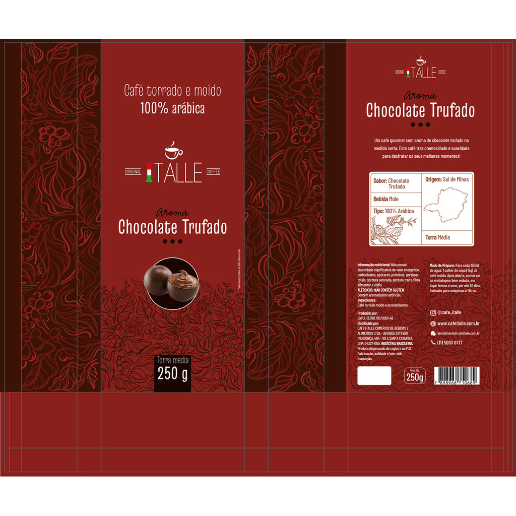 KIT 2 CAFÉ TORRADO E MOIDO AROMA CARAMELO E TRUFADO 500g - TOTAL 500g - 2 PACOTES DE 250G - 1 PACOTE CHOCOLATE COM CARAMELO 250G - 1 PACOTE CHOCOLATE TRUFADO 250G CAFÉ TORRADO E MOIDO AROMA CARAMELO 250g Descubra o prazer de saborear um café gourmet com o Café Torrado e Moído Aroma Caramelo da marca Cafe Italle. Este café em pó de 250g é feito com grãos 100% Arábica, garantindo uma experiência de sabor inigualável. Com uma torra média, o café apresenta uma cremosidade excepcional e uma doçura única, ideal para acompanhar os seus melhores momentos. Além disso, é livre de TACC, tornando-o uma opção segura para pessoas com restrições alimentares. O produto é novo e vem em um prático pacote, perfeito para manter a frescura do café. Aproveite a combinação perfeita de aroma e sabor com este delicioso café aromatizado, que certamente encantará o seu paladar! Um café gourmet com aroma de chocolate trufado na medida certa. Este café traz cremosidade e suavidade para desfrutar os seus melhores momentos!