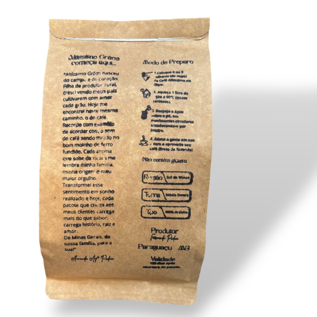 CAFÉ ALTÍSSIMO – TRADICIONAL ARTESANAL 100% ARÁBICA | 250g Já imaginou sentir na sua xícara o verdadeiro sabor de um café cultivado com carinho, colhido com cuidado e produzido diretamente na fazenda? Esse é o Café Altíssimo: um café 100% arábica, tradicional e artesanal, com o sabor único que só as montanhas do Sul de Minas oferecem. Origem: Paraguaçu – MG | Sul de Minas, a região mais famosa do Brasil pela qualidade de seus cafés. Por que escolher o Café Altíssimo? * Produção 100% artesanal – cada grão tratado com cuidado * Café tradicional, encorpado e saboroso, como o de antigamente * Grãos selecionados 100% arábica, direto da nossa fazenda * Pacote de 250g ideal para consumo diário * Frescor garantido – vai da roça para sua casa * Exclusividade: não é café de mercado, é café de fazenda! * Torrado e moído com cuidado para preservar o sabor e aroma (poucas horas antes do envio) * Garanta já o seu e descubra por que o Café Altíssimo conquista na primeira xícara! Entregamos para todo o Brasil com rapidez e segurança. Clique em COMPRAR AGORA e leve o sabor da fazenda até sua mesa!