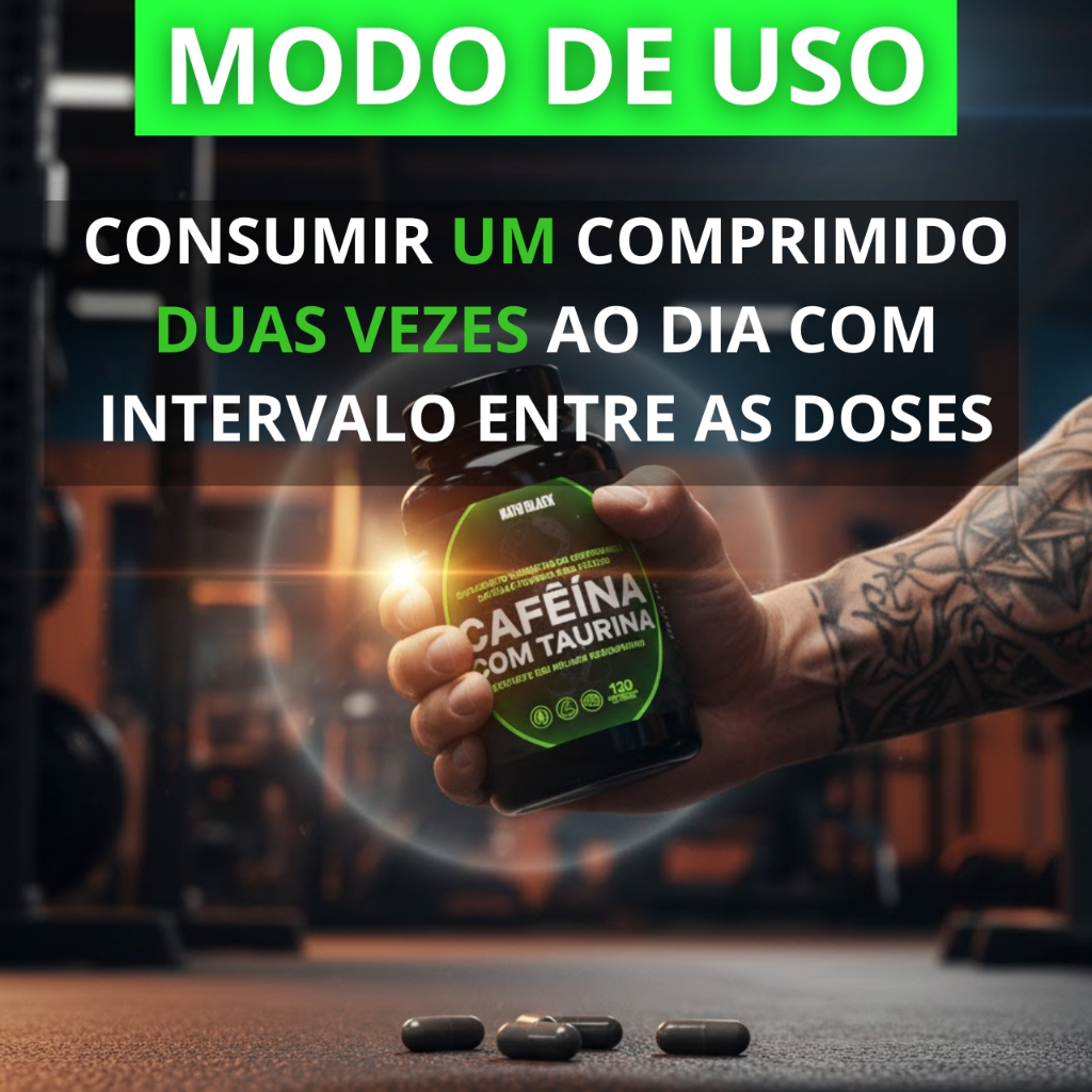 CAFEÍNA COM TAURINA NATU BLACK Cada Pote Contém : 120 Comprimidos 1000mg ___________________ MODO DE USO : Ingerir : 02 comprimidos por dia PRODUTO PARA MAIORES DE 19 ANOS ___________________ INGREDIENTES : Cafeína e Taurina NÃO CONTÉM GLÚTEN ____________________ Advertência : Gestantes, idosos, menores de 18 anos, crianças, lactantes e pessoas que apresentam doenças ou alterações fisiológicas, somente devem consumir este produto sob orientação de nutricionista ou médico.