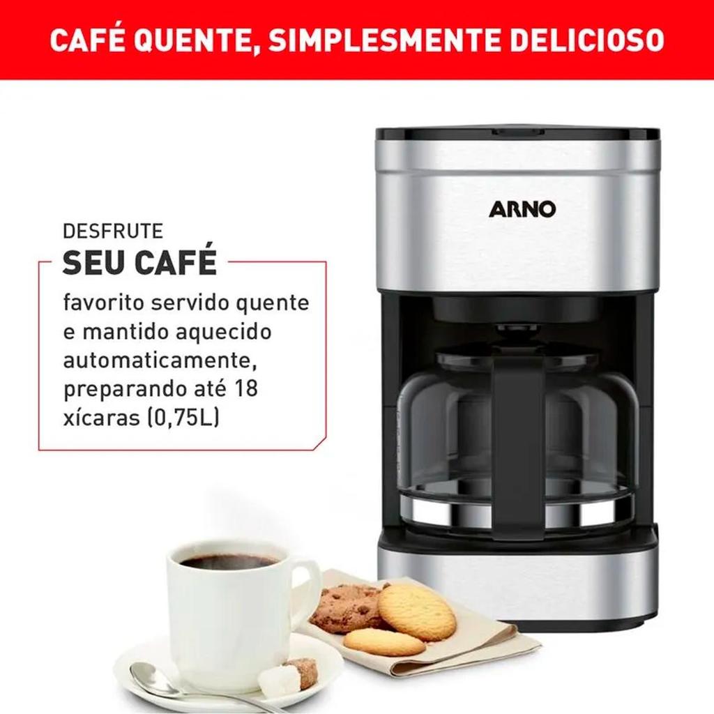 Cafeteira Elétrica com Filtro Preferita Inox 750ml 550W - Arno A Cafeteira Elétrica Arno Preferita Inox é ideal para quem quer café quentinho com praticidade e um visual elegante na cozinha. Pensada para simplificar a rotina, ela permite preparar o café de forma rápida e sem complicações, com um conjunto compacto e moderno que combina com diferentes estilos de ambiente, deixando as manhãs mais leves e organizadas. Com capacidade de 750 ml (0,75 L), serve até 18 xícaras, sendo perfeita para famílias, visitas ou para quem gosta de deixar café pronto durante o dia. O preparo fica ainda mais confortável graças ao tanque de água fácil de encher e à jarra de vidro resistente, que facilita o manuseio e a visualização do café. Além disso, a placa de aquecimento mantém a bebida aquecida enquanto a cafeteira estiver ligada na tomada, garantindo sabor e temperatura por mais tempo. Para manter a cozinha limpa, a Arno Preferita conta com sistema corta-pingos, que ajuda a evitar sujeira ao servir antes do fim do preparo. E para quem busca economia e praticidade, ela acompanha filtro permanente removível, reduzindo o uso de filtros de papel e facilitando a limpeza. A colher medidora também acompanha o conjunto, ajudando a acertar a proporção e deixar o café no ponto certo com mais consistência. O acabamento em aço inoxidável traz um toque premium e melhora a durabilidade no dia a dia, com limpeza simples. Com 550W de potência, cabo de 35 cm e porta-fios, é uma cafeteira pensada para ser funcional, bonita e prática, acompanhando tudo o que você precisa para começar bem o dia: cafeteira, jarra, filtro, colher e manual com garantia. Trabalhamos apenas com produtos 100% originais, enviados com nota fiscal e garantia do fabricante de 1 ano. Especificações: Marca: Arno Modelo: Preferita Inox Potência: 550 W Capacidade: 750 ml / até 18 xícaras Material: Plástico, metal e vidro Jarra: Vidro Filtro: Permanente removível Sistema: Corta-pingos Aquecimento: Placa de aquecimento (mantém quente enquanto ligada) Comprimento do cabo: 35 cm Porta-fios: Sim Consumo: 9,32 kW/h por mês Conteúdo da embalagem: 1 cafeteira, 1 jarra de vidro, 1 filtro removível, 1 colher medidora, manual e certificado de garantia Produtos enviados de imediato com despacho em até 24 horas úteis após a confirmação do pagamento.