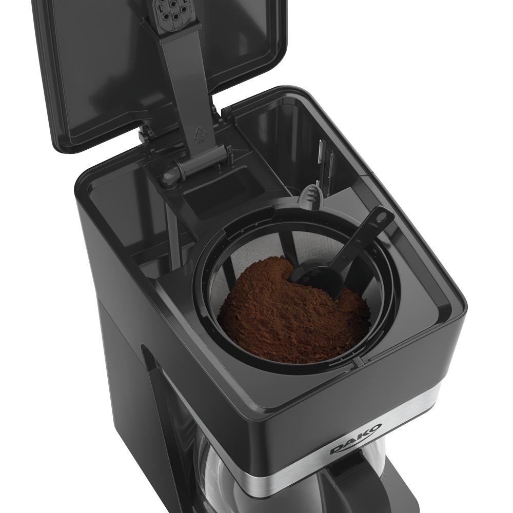 Seja para começar o dia, manter o ritmo durante o trabalho ou compartilhar momentos especiais, a Cafeteira Dako é sua companheira ideal para todas essas ocasiões. Com capacidade de 1,5 litro, ela prepara até 38 cafezinhos de uma só vez. O sistema corta-pingos permite servir sem sujeira, evitando desperdícios. E, com a função manter aquecido, o café fica sempre quentinho por mais tempo, pronto para ser saboreado a qualquer hora. Além de eficiente, a Cafeteira Dako é sustentável, acompanha um filtro reutilizável, ajudando a economizar todos os meses com filtros de papel e colher dosadora. O café fica pronto rapidinho, é só ligar e, em um piscar de olhos, já está na xícara. Combinando praticidade, sustentabilidade e rapidez, ela torna seus dias muito mais saborosos. Na hora de comparar, você vai perceber que a Dako surpreende além dos fogões. Atributos e benefíciosPrepara até 38 cafezinhos - Com 1,5 litro Sistema corta pingo - Permite servir enquanto o café é preparado. Função manter aquecido - Deixa o café quentinho por mais tempo. Completa e sustentável - Acompanha filtro reutilizável e colher dosadora Piscou, tomou - Tenha café pronto em poucos minutos. Ficha Técnica: Marca: Dako Modelo: Elétrica Voltagem: 127V e 220V Potência: 950W Capacidade em (L): 1,5 Litros Xícaras: 38 Cor: Preto Brilhoso Tipo de acabamento: Inox Jarra de Vidro: Sim Sistema corta pingo: Sim Manter aquecido: Sim Filtro, porta filtro e colher: Sim Pés antiderrapante: Sim Medidas do produto sem embalagem (Largura x Altura x Profundidade) em cm: 18,84 x 33,17 x 25,35 cm Peso sem embalagem: 1,64 Kg Tamanho do Cabo em (M): 0,90 metros Plug (A): 10A Garantia: 12 Meses de garantia contra defeitos da fabricação