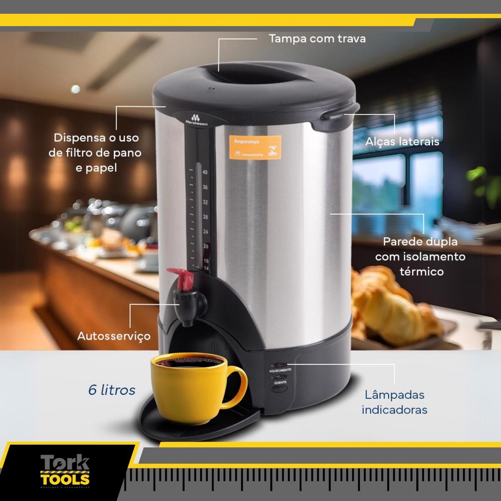 Cafeteira Automática Marchesoni 6 Litros – Alta Capacidade, Qualidade e Eficiência Para Seu Estabelecimento A Cafeteira Automática Marchesoni de 6 Litros foi desenvolvida para quem precisa de alto desempenho e praticidade no preparo de grandes volumes de café com qualidade profissional. Ideal para restaurantes, cafeterias, hotéis e escritórios, ela conta com sistema 100% automático, que garante praticidade no dia a dia: basta adicionar água e pó de café, e o equipamento faz todo o processo, entregando um café sempre fresco, quente e saboroso. Com capacidade para 6 litros, atende com agilidade locais de alto fluxo, sem perder a consistência no sabor. Seu sistema com parede dupla impede que o calor interno seja transferido para a parte externa, proporcionando mais segurança para o usuário. Destaques da Cafeteira Automática Marchesoni 6L: * Sistema 100% automático: preparo prático e sem complicações. * Capacidade para 6 litros: ideal para servir um grande número de pessoas. * Padrão de qualidade e sabor: mantém a temperatura ideal e sabor do café. * Mais segurança: parede dupla com isolamento térmico. * Economia e sustentabilidade: dispensa filtros descartáveis. * Design moderno e robusto: fabricada em aço inox para maior durabilidade. * Versátil: perfeita para autosserviço ou preparo em larga escala. Especificações Técnicas: - Capacidade: 6 litros - Tempo médio de preparo: 30 minutos - Consumo de energia: 1000W (1,00 kWh) - Tensão: 127V ou 220V (Escolher no ato da compra) - Material: Aço inox com parede dupla - Dimensões (CxLxA): 25 x 28 x 38 cm - Peso líquido / bruto: 3,0 kg / 3,5 kg Com a Cafeteira Automática Marchesoni 6 Litros, você garante um café quente, padronizado e pronto para servir o dia inteiro. Ideal para quem busca produtividade, segurança e excelente apresentação no serviço de bebidas. Marca: Marchesoni Modelo: Cafeteira Automática 6L