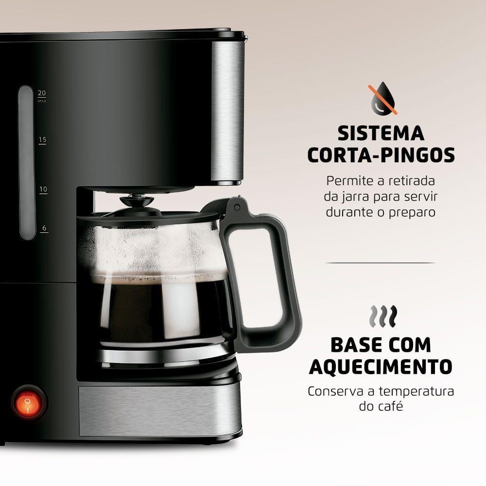 Cafeteira Elétrica Mondial 60hz 220V A Cafeteira Elétrica C-43-20X-SI prepara até 20 xícaras de café. Com Jarra de vidro fácil de lavar, ela tem porta filtro permanente, que dispensa filtro de papel. Tem ainda base aquecida para café quente a qualquer hora. Sua jarra de vidro não fica com resíduos e odores e pode ser levada à mesa. Com seu sistema corta pingos, você pode retirar a jarra para servir o café mesmo durante o preparo. Seu porta filtro é permanente e pode ser retirado, sendo mais econômico e ecológico. Já a tampa basculante traz mais facilidade na hora de colocar a água e o pó de café. Esta cafeteira tem ainda um indicador de nível de água, mostrando quantas xícaras serão feitas, para você passar o café na medida certa. A Cafeteira Elétrica Dolce Arome C-43-20X-SI foi desenvolvida para uso doméstico, sendo melhor para uso residencial. Tudo isso com 1 ano de garantia Mondial. Especificações Técnicas: - Modelo: C-43-20X-SI - Cor: Preto e Inox - Voltagem (Tensão): 220V - Itens inclusos: 01 Cafeteira; 01 Manual de instruções - Material da jarra: Vidro - Comprimento do cabo: 80cm - Capacidade do produto: Até 20 xícaras - Luz indicadora: Sim - Baterias são necessárias: Não - Tipo de tomada: 10A - Alimentação: Energia Elétrica - Potência: 550W - Quantidade em ML por xícara: 40ml - Filtro: Filtro permanente - Peso: 1,300kg - Garantia: 01 ano - Dimensões: 26cm x 16cm x 22cm (AxLxC)