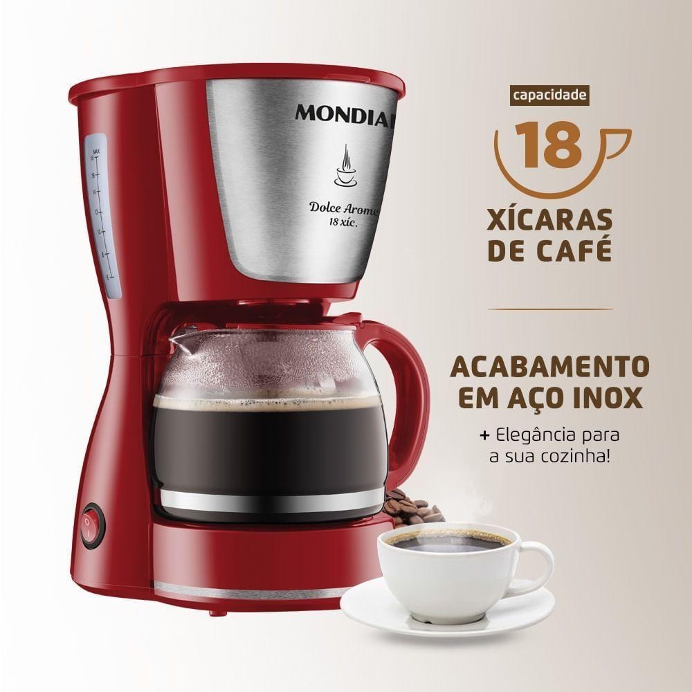 Cafeteira Elétrica Mondial Dolce Arome C-35-18X Jarra De Vidro 60hz 127V Comece seu dia com aroma e sabor! A Cafeteira Elétrica Mondial Dolce Arome C-35-18X tem capacidade para servir até 18 xícaras de café. Possui filtro permanente e porta-filtro removível que proporcionam mais sustentabilidade ao meio ambiente. Para conservar a temperatura, conta com jarra de vidro e base com aquecimento. Com design elegante e compacto, é ideal para valorizar o seu cantinho do café. Saiba mais sobre a Dolce Arome C-35-18X da Mondial: Características: - 18 XÍCARAS DE CAFÉ: Garantia de um cafezinho saboroso para toda a família. - DESIGN SOFISTICADO: Na cor vermelha e acabamento em aço escovado, a cafeteira proporciona mais elegância à sua cozinha. - FILTRO PERMANENTE E PORTA-FILTRO REMOVÍVEL: A cafeteira é ecologicamente correta, pois dispensa a utilização do filtro de papel. O reaproveitamento do filtro proporciona mais economia e sustentabilidade. - SISTEMA CORTA-PINGOS: Permite a retirada da jarra para servir o café durante o preparo. - JARRA DE VIDRO: A jarra é fácil de lavar e não deixa resíduos ou odores. O item também proporciona mais praticidade para levar à mesa e servir. - BASE COM AQUECIMENTO: Conserva a temperatura do café. - INDICADOR DO NÍVEL DE ÁGUA: Permite o preparo da quantidade desejada de xícaras de café. - TAMPA BASCULANTE: Mais facilidade na hora de colocar a água e o pó de café. - LIGA/DESLIGA LUMINOSO: Indica o funcionamento do produto. - UM ANO DE GARANTIA MONDIAL: A Mondial é a escolha de milhões de consumidores. Mondial, a escolha inteligente! Especificações Técnicas: - Modelo: C-35-18X - Cor: Vermelho/Inox - Voltagem (Tensão): 127V - Itens inclusos: 01 Cafeteira e 1 Manual de Instruções - Material da jarra: Jarra em vidro - Comprimento do cabo: 1,50m - Capacidade do produto: 18 xícaras - Luz indicadora: Sim - Baterias são necessárias: Não - Tipo de tomada: 10A - Alimentação: Energia Elétrica - Potência: 550W - Quantidade em ML por xícara: Não se aplica - Filtro: Removível e Lavável - Peso: 0,940kg - Garantia: 1 ano - Dimensões: 27,5cm x 20,2cm x 16,2cm (AxLxP)