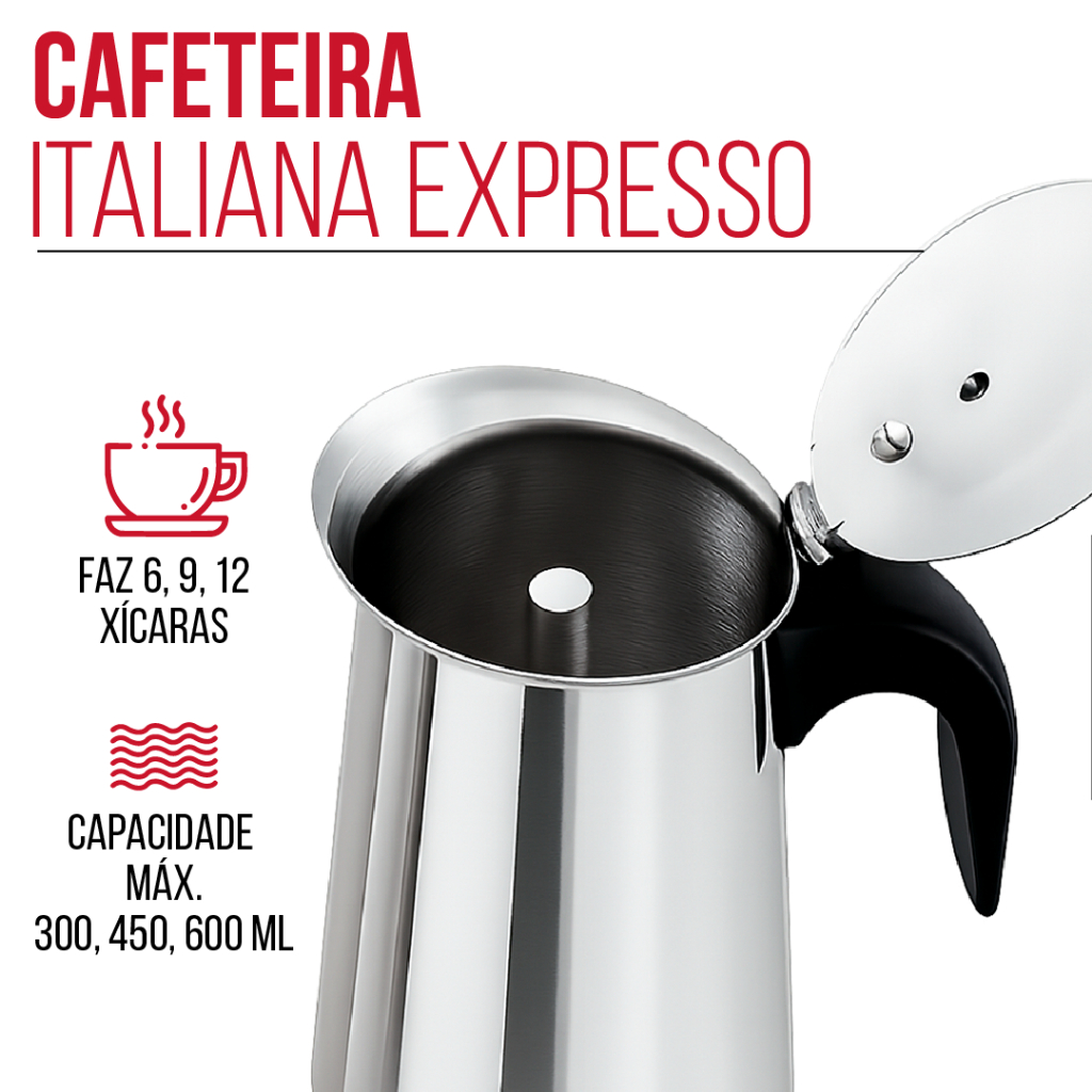 Leve para sua cozinha o charme e a eficiência da tradicional cafeteira italiana em aço inox, perfeita para preparar um café encorpado, quente e saboroso em poucos minutos. Com capacidade de até 600ml, ela serve aproximadamente 12 xícaras de café (50ml) por preparo, sendo ideal para famílias ou quem não abre mão de um bom café no dia a dia. 💠 Destaques do produto: ✔️ Produzida 100% em aço inox de alta qualidade, resistente ao calor e à corrosão ✔️ Compatível com fogões a gás, elétrico, vitrocerâmico e por indução ✔️ Alça anatômica com proteção térmica: conforto e segurança no manuseio ✔️ Sistema clássico de preparo por pressão: preserva o aroma e sabor do café ✔️ Fácil de desmontar, lavar e usar novamente 📏 Especificações Técnicas: • Capacidade: 600ml (aprox. 12 xícaras expresso) • Capacidade: 450ml (aprox. 9 xícaras expresso) • Capacidade: 300ml (aprox. 6 xícaras expresso) • Pode ser usada em fogão a gás, elétrico e vitrocerâmico • Altura aproximada: 20 cm • Diâmetro da base: 10 cm • Material: Aço inox polido + alça em baquelite térmica 📦 O que você recebe: • 1 Cafeteira Italiana Inox com filtro interno, tampa e válvula de segurança 🔧 Modo de uso: • Adicione água na base até o limite da válvula • Encaixe o filtro com o pó de café • Rosqueie a parte superior, leve ao fogo baixo e aguarde o café subir • Sirva direto no bule superior ⚠️ ((UTILIZE O PRODUTO SEMPRE EM FOGO BAIXO PARA GARANTIR MAIOR DURABILIDADE E SEGURANÇA DURANTE O USO. ESTE ITEM É APROVADO PELO INMETRO, ASSEGURANDO QUALIDADE, CONFIABILIDADE E PADRÕES DE SEGURANÇA CERTIFICADOS.)) ✅ Pronta entrega | Envio com nota fiscal | Produto durável e funcional para todos os dias!