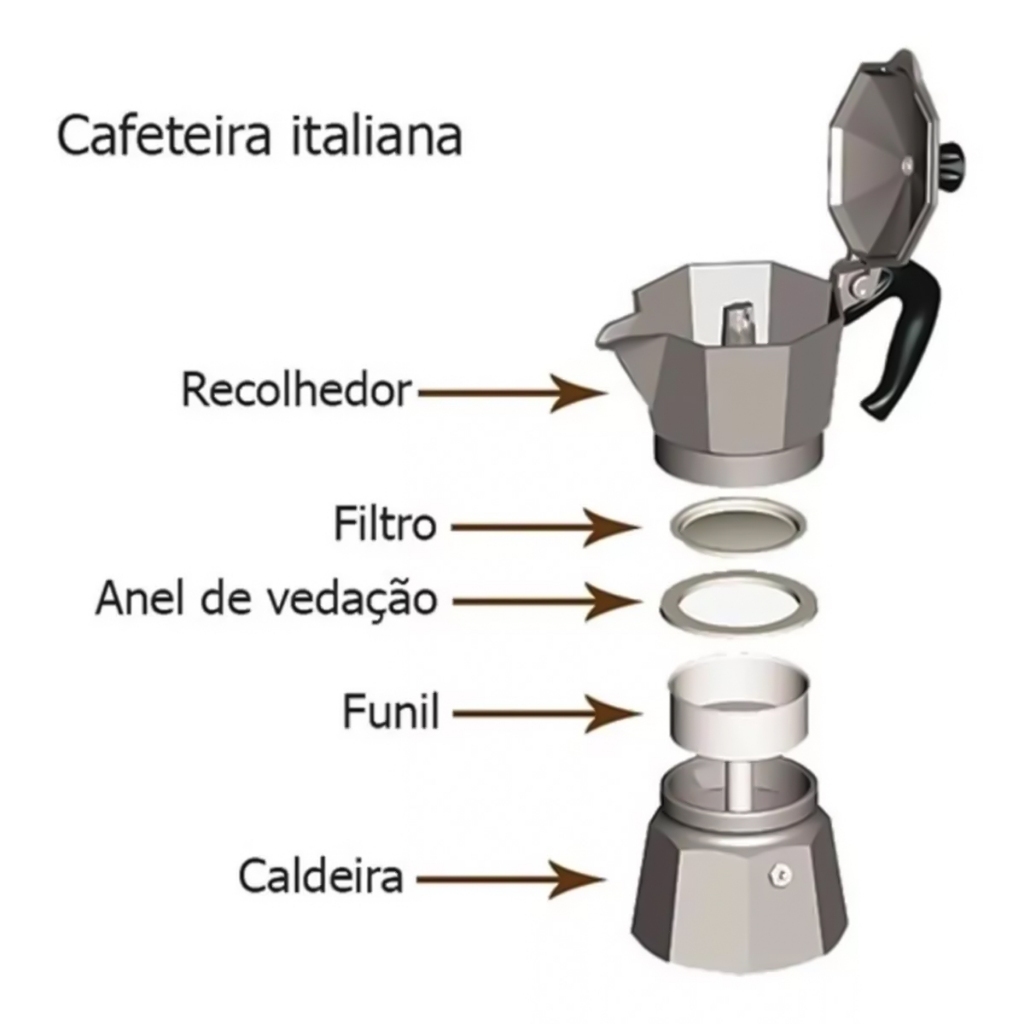 A cafeteira italiana de alumínio é um clássico no preparo de café expresso em casa. Com design elegante e funcional, ela permite você preparar um café forte e aromático, com a cremosidade característica do espresso italiano. Características: Material: Confeccionada em alumínio de alta qualidade, um material leve e durável, ideal para a condução do calor. A parte inferior, que entra em contato com a chama, geralmente possui um acabamento em aço inox para maior durabilidade. Capacidade: Com capacidade para 3/9 xícaras, é perfeita para preparar café para você ou para compartilhar com um amigo. Dimensões: Com 13 cm de altura e 9 cm de diâmetro, ela se adapta a diversos fogões e é fácil de armazenar. Design: Design clássico e elegante, com detalhes em aço inox que conferem um toque moderno. Funcionamento: O funcionamento é simples e prático: basta adicionar água fria na parte inferior, café moído no filtro e levar ao fogo. A pressão gerada pelo vapor faz com que a água quente suba pelo filtro, extraindo todo o sabor e aroma do café. Benefícios: Café de qualidade: Permite preparar um café expresso cremoso e aromático, com sabor intenso. Prática: Fácil de usar e limpar. Versátil: Pode ser utilizada em diversos tipos de fogão, incluindo fogão a gás, elétrico e indução. Durabilidade: Com os devidos cuidados, a cafeteira italiana pode durar por muitos anos. Design: Design atemporal que combina com qualquer cozinha. Como usar: Encher a base: Encha a parte inferior da cafeteira com água fria até a válvula de segurança. Adicionar o café: Coloque o café moído no filtro, sem apertá-lo muito. Montar a cafeteira: Enrosque a parte superior na inferior, certificando-se de que esteja bem fechada. Levar ao fogo: Leve a cafeteira ao fogo baixo, sem tampa. Retirar do fogo: Quando o café começar a subir e borbulhar, retire a cafeteira do fogo. Servir: Sirva o café imediatamente para apreciar todo o seu aroma e sabor.