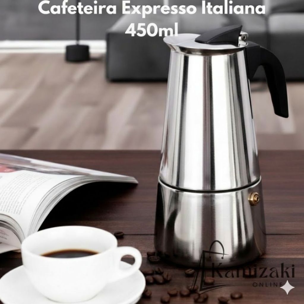 Bem-vindo à Kamizaki Online! ☕ Agradecemos sua visita! Somos especialistas em trazer itens que unem elegância e funcionalidade para o seu lar. Aqui, cada detalhe é pensado para proporcionar a melhor experiência de compra. 🚀 ENVIO RÁPIDO: Seu pedido é postado com agilidade para que você desfrute do seu café o quanto antes! ✅ ENTREGA GARANTIDA: Receba seu produto com total segurança e suporte. Sua satisfação é o nosso compromisso. Cafeteira Italiana Expresso em Aço Inox - 450ml (9 Xícaras) Prepare um café encorpado, aromático e com o autêntico sabor do expresso italiano no conforto da sua casa. Nossa cafeteira moka é fabricada em aço inox de alta qualidade, o que garante muito mais brilho, durabilidade e resistência, além de não deixar resíduos metálicos no sabor. Com capacidade para 450ml, ela prepara até 9 xícaras (tamanho café expresso), sendo ideal para servir a família ou receber visitas com sofisticação. ESPECIFICAÇÕES TÉCNICAS: Produto: Cafeteira Italiana Moka Kamizaki Capacidade: 450ml (Aproximadamente 9 xícaras de café expresso) Material: Corpo em Aço Inox Premium com cabo em polímero isolante térmico. Dimensões Aproximadas: * Altura: 22cm a 23cm Diâmetro da Base: 10,5cm a 11,5cm Compatibilidade: Pode ser utilizada em fogões a gás e elétricos. DIFERENCIAIS DO NOSSO PRODUTO: Design Sofisticado: Acabamento espelhado que embeleza sua cozinha. Segurança: Válvula de segurança integrada para controle de pressão. Sabor Autêntico: Sistema de pressão a vapor que extrai o máximo do grão. Fácil Limpeza: Material totalmente lavável e resistente à oxidação. Agradecemos a confiança na Kamizaki Online! ❤️ Tem alguma dúvida sobre o modo de preparo ou sobre o envio? Nossa equipe está pronta para te ajudar agora mesmo! Basta nos chamar no Chat. Tenha ótimos momentos com um café perfeito!
