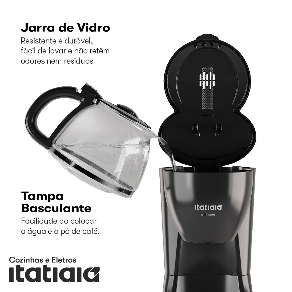 ☕ Cafeteira Elétrica Itatiaia 15 Xícaras: Praticidade e Sabor O lançamento da Itatiaia que combina funcionalidade e design, para um café delicioso e na temperatura perfeita! A Cafeteira Elétrica Itatiaia oferece a funcionalidade e praticidade que encantam, com o acabamento sofisticado em Preto Brilhante. ✨ Destaques e Diferenciais Filtro Permanente: Esqueça os filtros de papel! O filtro permanente é prático, sustentável e reutilizável, facilitando o preparo e ajudando você a economizar no dia a dia. Jarra de Vidro e Sistema Corta-Pingos: A jarra é em vidro e o sistema corta-pingos evita acidentes e mantém tudo limpo. Sirva o café a qualquer momento, sem sujeira nem desperdício. Potência Ideal: Versão de 15 xícaras com potência de 550W para um desempenho ideal no dia a dia. Qualidade e Suporte: Possui o Selo de Qualidade Itatiaia e reconhecimento comprovado de suporte ao consumidor. 🔌 Especificações Técnicas Capacidade: 15 Xícaras Potência: 550W Voltagem: 127V OU 220V Filtro: Permanente (Reutilizável) Acabamento: Preto Brilhante Garantia Total: 360 dias (1 ano) contra defeitos de fabricação IMPORTANTE: Certifique-se de selecionar a voltagem correta (127V ou 220V) no momento da compra. Garanta já a sua Cafeteira Elétrica Itatiaia. Toda casa merece!