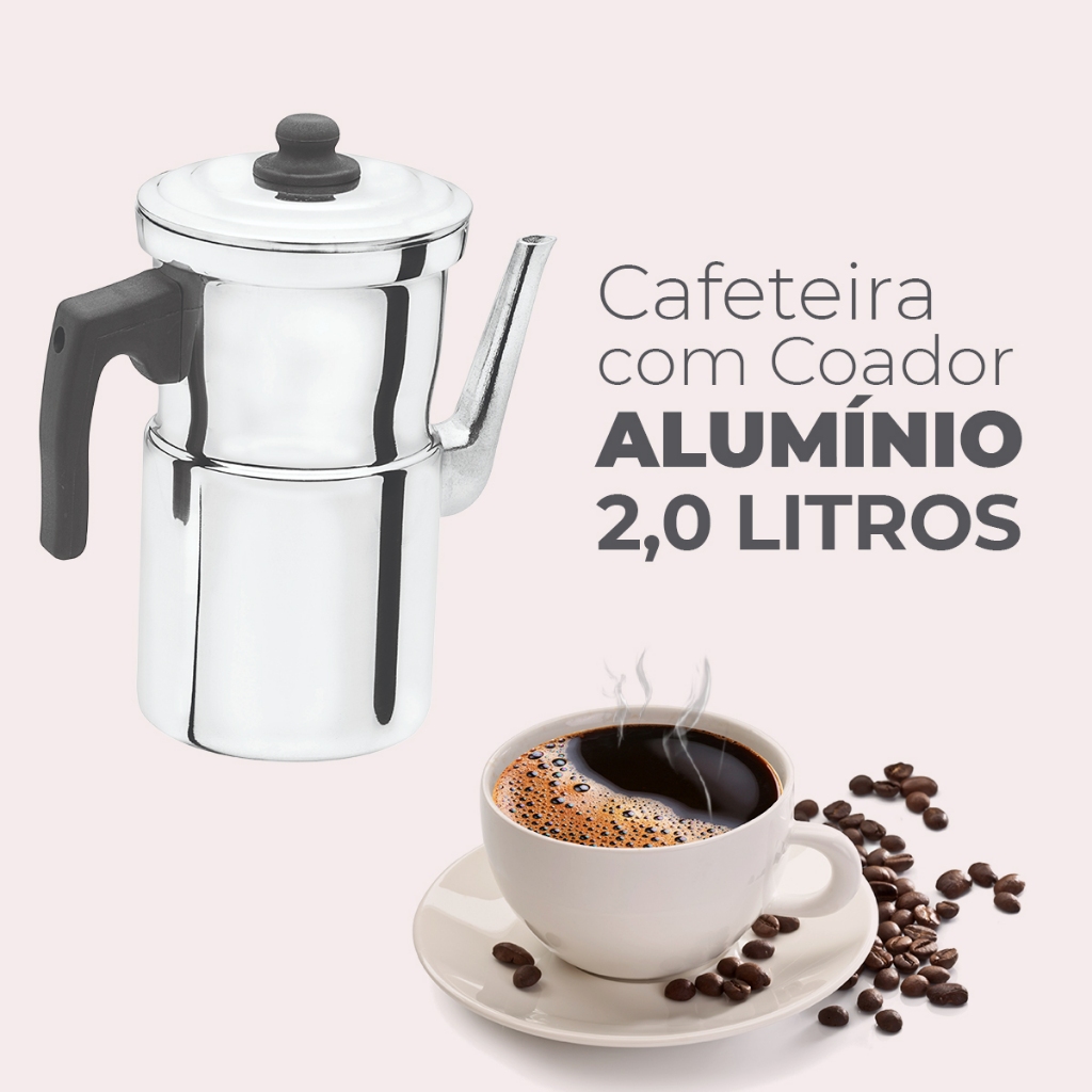COMPOSIÇÃO 1 - Cafeteira Polida C/coador 2,0 Litros Alumínio Fort-lar 2 ** ESPECIFIÇÕES TÉCNICAS DO PRODUTO** • Liga de Alumínio certificada; • Cabo de baquelite anti-chama; • Produto de qualidade. **UTILIZAÇÃO DO PRODUTO** • Ferver / Aquecer / Esquentar / Armazenar. **CUIDADOS ANTES DO USO E CONSERVAÇÃO DO PRODUTO** • Remova a etiqueta e lave para retirar possíveis excessos de resíduos de fabricação; • Alimentos como sal, Alho e molho de tomate, quando ficam muito tempo em contato com o utensilio podem ocasionar manchas e corrosão. ** SEGURANÇA NO USO DO PRODUTO** • Não deixe os cabos virados para fora do fogão; • A chama não deve ultrapassar a base da peça; • Utilize luvas térmicas no manuseio de utensílios quentes; • É recomendável o reaperto dos parafusos periodicamente; • Produto para uso doméstico em fogão a gás. ** GARANTIA*** • Garantia em casos de defeitos de fabricação. **ENVIO** • Envio imediato; • Produtos em estoque a pronta entrega. ** PRAZO DE ENTREGA E VALOR DO FRETE** • O prazo de entrega varia de acordo com o CEP do destino; • Consultar o prazo de entrega e o valor do frete direto no link do produto. **IMPORTANTE** • Antes de comprar, certifique-se de que seus dados estejam corretos, pois serão com eles que concluiremos a venda; • Tire todas as dúvidas no campo de Perguntas e Respostas abaixo antes de finalizar a compra. SERÁ UM PRAZER ATENDE-LOS