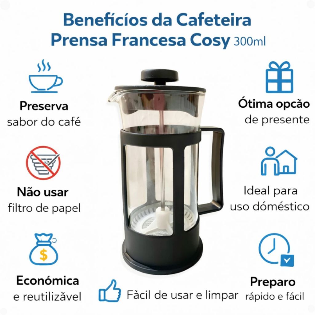 A Cafeteira Prensa Francesa Cosy 300ml é ideal para quem deseja preparar café, chá ou infusões com mais sabor e aroma, preservando os óleos naturais do grão. Compacta, prática e elegante, ela é perfeita para uso diário, sendo indicada para preparo de 1 a 2 xícaras. Com sistema de filtragem em malha metálica reutilizável, não precisa de filtro de papel, tornando o preparo mais econômico e sustentável. Seu design moderno com copo de vidro resistente permite visualizar o preparo, garantindo praticidade e estilo na cozinha. Perfeita para quem gosta de café gourmet, café especial, cappuccino, chá ou infusões naturais.