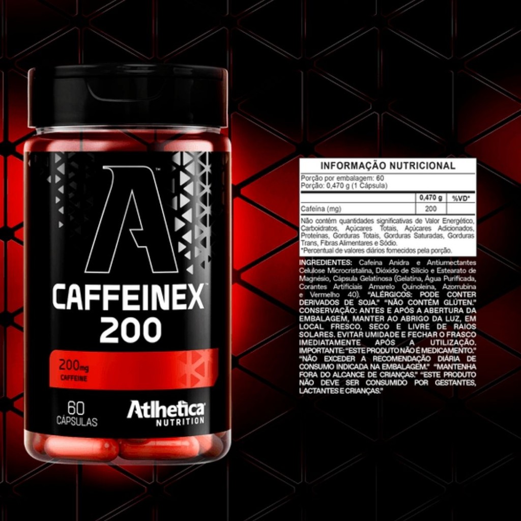 Sobre o produto: Caffeinex 200mg da Atlhetica Nutrition é um suplemento alimentar em cápsulas à base de cafeína anidra, ideal para quem busca mais foco, energia e disposição nos treinos e atividades do dia a dia. A cafeína é um estimulante natural do sistema nervoso central que contribui para o aumento da resistência, melhora do desempenho físico e redução da percepção de esforço durante o exercício. Como consumir: Consumir 2 cápsulas ao dia (200 mg de cafeína), ou conforme orientação de médico ou nutricionista. USO ADULTO. Benefícios - Aumento da energia e disposição - Melhora do foco e da concentração - Estímulo do sistema nervoso central - Auxilia no desempenho físico - Ideal para pré-treino Alergênicos: Pode conter derivados de soja.Não contém glúten. Ingredientes: Cafeína anidra, celulose microcristalina, dióxido de silício e estearato de magnésio.Cápsula: gelatina, água purificada, corantes artificiais amarelo quinolina e amarelo crepúsculo. Advertências - Este produto não é um medicamento. - Não exceder a recomendação diária de consumo indicada na embalagem. - Não deve ser consumido por gestantes, lactantes e crianças. - Manter fora do alcance de crianças. - Conservar ao abrigo da luz, em local fresco, seco e livre de umidade. - Fechar o frasco imediatamente após o uso. Conclusão: Caffeinex 200mg é uma opção prática e eficaz para quem precisa de mais energia e foco durante os treinos ou atividades do dia a dia, com a qualidade Atlhetica Nutrition.