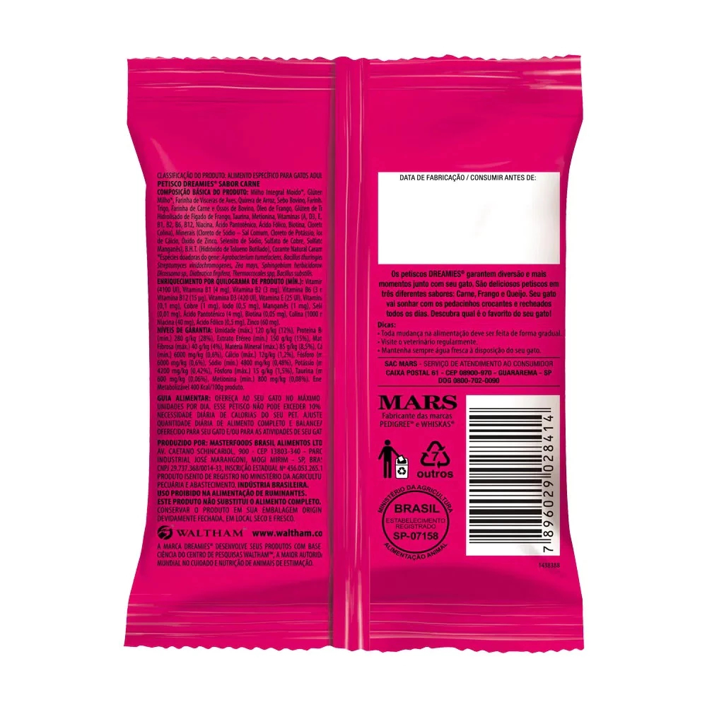 Petisco Dreamies Gatos Adultos Carne 40g - Indicado para gatos; - Ideal para gatos Adultos; - Petisco rico em nutrientes; - Crocante por fora macio por dentro; - Rende mais de 20 dias (*3 pedacinhos por dia); - Irresistível sabor de carne. O Petisco Dreamies garantem diversão e mais momentos junto com seu gato. Os gatos simplesmente não conseguem resistir ao excelente sabor das guloseimas DREAMIES. O seu gatinho vai sonhar com os pedacinhos crocantes e recheados todos os dias. Descubra qual é o favorito do seu gato! Petiscos para gatos podem fazer parte da dieta dos felinos, desde que não sejam oferecidos de forma exagerada. Com sabor atraente e delicioso, os gatos vão a loucura quando veem os petiscos por perto. Ingredientes Farinha de Subprodutos de Frango, Glúten de Milho*, Quirera de arroz, Milho Integral Moído*, Gordura de Frango, Gordura Bovina, Glúten de Trigo, Farinha de Trigo, Taurina, Metionina, Vitaminas (A, B1, B2, B6, B12, D3, E, K3, Ácido Fólico, Niacina, Biotina, Cloreto de Colina e Ácido Pantotênico), Minerais (Cloreto de Sódio (Sal comum), Cloreto de Potássio e Óxido de Zinco), Palatabilizantes, Antioxidante e Corantes.