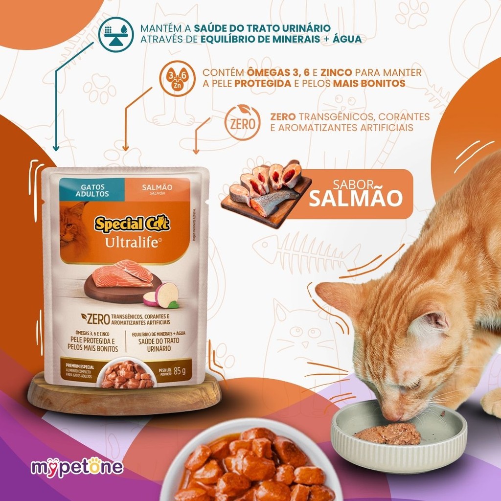 Special Cat Ultralife Sachê Adultos Sabor Salmão – 85g Alimento úmido completo e balanceado para gatos adultos, com sabor premium de salmão e fórmula que promove a saúde do trato urinário e deixa a pelagem mais brilhante. Destaques Principais - Sem corantes e aromatizantes artificiais - Ômegas 3 e 6 + zinco orgânico: pele protegida e pelos mais bonitos - Saúde do trato urinário - Toque de extrato de urucum e cúrcuma para antioxidantes naturais Análise Nutricional Garantida (por kg) Proteína Bruta: mín. 90 g Gordura (Extrato Etéreo): mín. 30 g Umidade: máx. 820 g Energia Metabolizável: 845 kcal Ingredientes Selecionados Farinha de salmão, carne mecanicamente separada de aves, biomassa de microalgas desidratada, extrato de Yucca schidigera, extrato de urucum e cúrcuma, mix de vitaminas e minerais essenciais. Perfeito para oferecer como única fonte de alimento ou misturado à ração seca, unindo sabor, nutrição e bem‑estar em cada sachê.