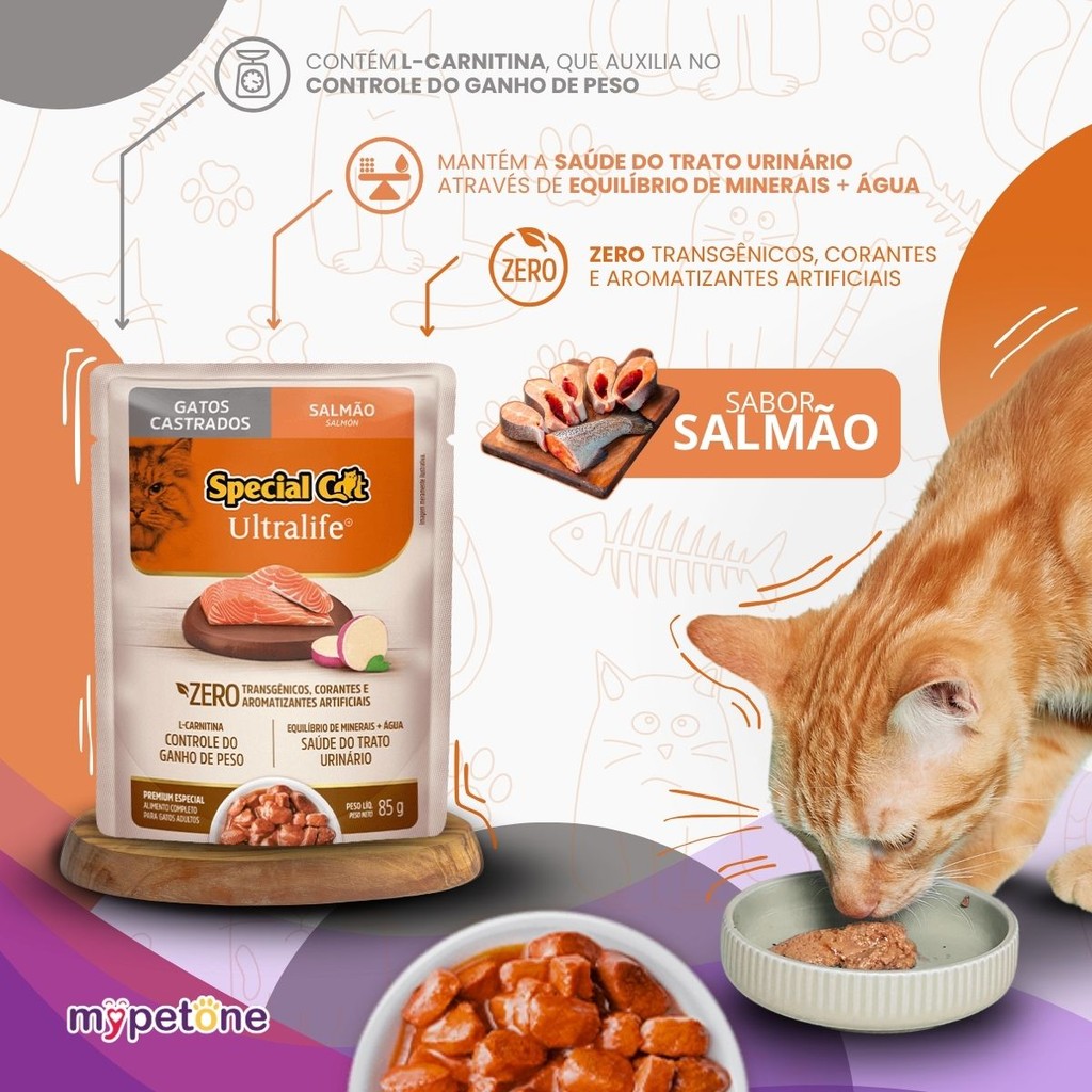 Special Cat Ultralife Sachê Castrados Sabor Salmão – 85g Alimento úmido completo e balanceado desenvolvido especialmente para gatos castrados. Com sabor irresistível de salmão e ingredientes funcionais, contribui para a manutenção da saúde urinária e o controle do peso corporal. Destaques Principais - Sem corantes e aromatizantes artificiais - L‑carnitina: controle do ganho de peso - Saúde do trato urinário - Com cúrcuma e extrato de urucum: antioxidantes naturais Análise Nutricional Garantida (por kg) Proteína Bruta: mín. 100 g Gordura (Extrato Etéreo): mín. 20 g Umidade: máx. 820 g Energia Metabolizável: 777 kcal Ingredientes Selecionados Farinha de salmão, carne mecanicamente separada de aves, biomassa de microalgas, L‑carnitina, extrato de Yucca, cúrcuma, extrato de urucum e complexo de vitaminas e minerais. Ideal para ser servido puro ou combinado à ração seca, oferecendo nutrição inteligente e sabor em cada sachê.