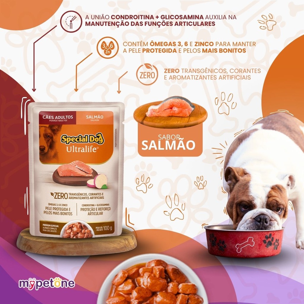 Special Dog Ultralife Sachê Adultos Sabor Salmão – 100g Alimento úmido completo e balanceado para cães adultos, com sabor premium de salmão. Feito com farinha de salmão e pedaços de carne cozidos a vapor com batata‑doce, sua fórmula rica em minerais, condroitina e glicosamina promove nutrição, saúde da pele e reforço articular. Destaques Principais - Sem corantes nem aromatizantes artificiais - Ômegas 3 e 6 + zinco orgânico: pele protegida e pelagem brilhante - Condroitina + glicosamina: proteção e reforço articular - Extrato de urucum e cúrcuma: antioxidantes naturais - Batata‑doce: reforço de imunidade e maior saciedade Análise Nutricional Garantida (por kg) Proteína Bruta: mín. 80 g Gordura (Extrato Etéreo): mín. 30 g Umidade: máx. 820 g Energia Metabolizável: 740 kcal Ingredientes Selecionados Farinha de salmão, carne mecanicamente separada de aves, batata‑doce, plasma sanguíneo desidratado, sulfato de glicosamina, sulfato de condroitina, biomassa de microalgas, extrato de Yucca schidigera, cúrcuma, mix de vitaminas e minerais essenciais. Perfeito para oferecer puro ou misturado à ração seca, garantindo sabor, bem‑estar e nutrição em cada sachê.
