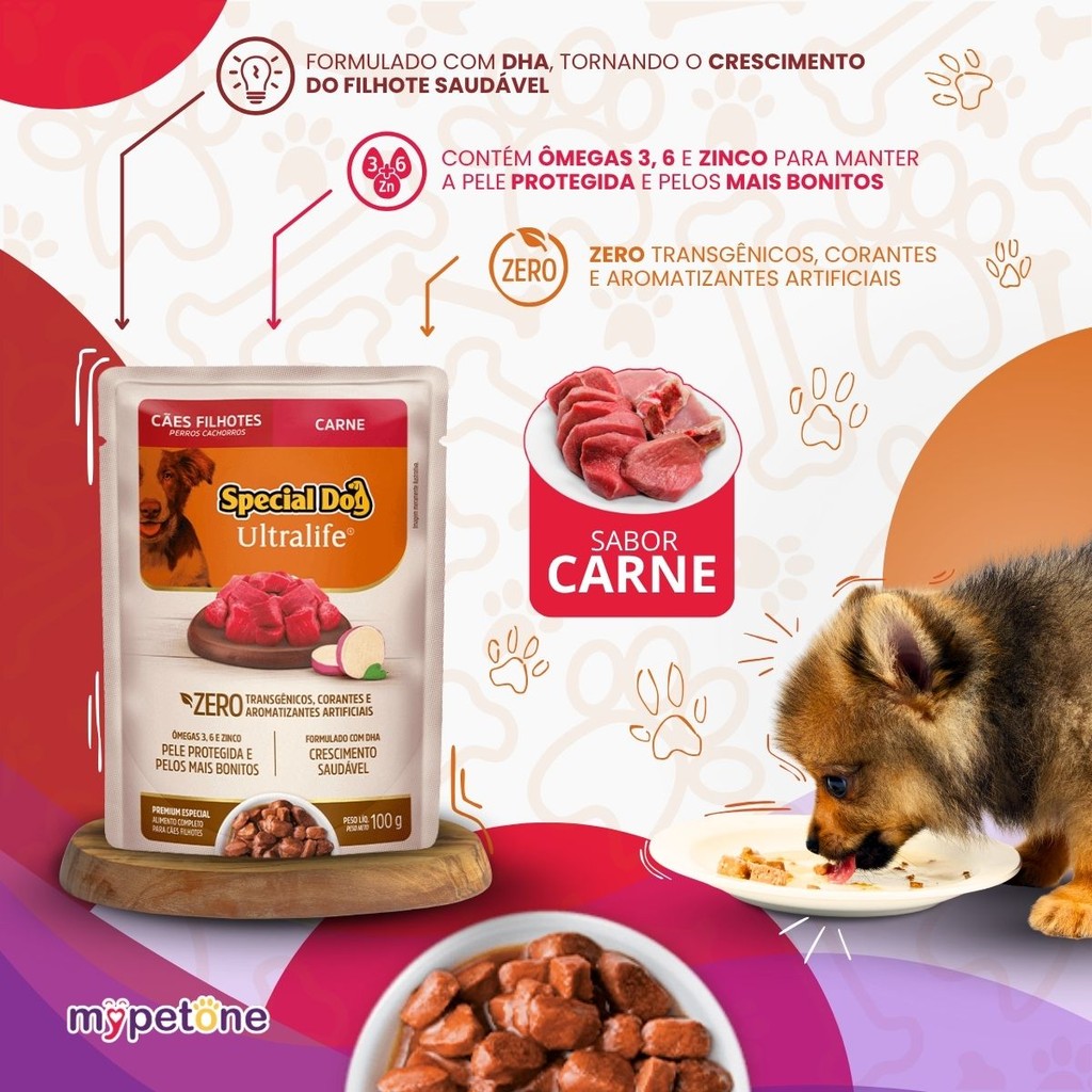 Special Dog Ultralife Sachê Filhotes Sabor Carne – 100g Sachê Special Dog Carne para Cães Filhotes é um alimento úmido completo e balanceado, formulado com minerais que auxiliam na absorção de nutrientes. Feito com pedaços de carne cozidos a vapor e batata‑doce, contribui para a proteção da pele e pelagem, além de auxiliar no crescimento saudável dos filhotes. Destaques Principais - Não contém corantes nem aromatizantes artificiais - Ômegas 3 e 6 + zinco orgânico: pele protegida e pelos mais bonitos - Com DHA para crescimento saudável Análise Nutricional Garantida (por kg) Proteína Bruta: mín. 95 g Gordura (Extrato Etéreo): mín. 40 g Umidade: máx. 820 g Energia Metabolizável: 800 kcal Ingredientes Selecionados Carne de bovino, carcaça de aves, miúdos de suíno, plasma sanguíneo desidratado, hemoglobina desidratada, biomassa de microalgas, gelatina, batata‑doce e mix de vitaminas e minerais essenciais. Perfeito para oferecer como única fonte de alimento ou misturado à ração seca, garantindo nutrição e sabor em cada sachê.
