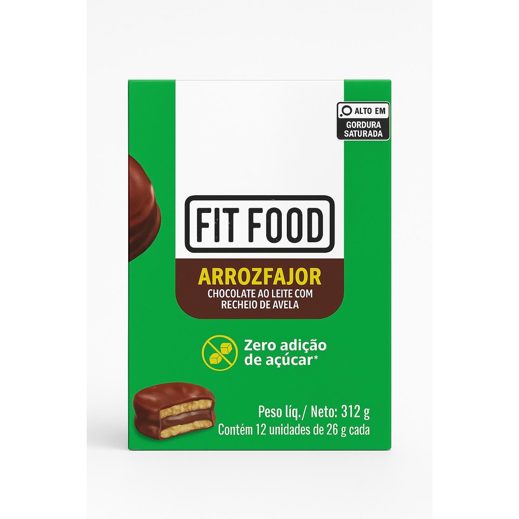 O Alfajor de Biscoito de Arroz com Recheio de Avelã e Cobertura de Chocolate ao Leite Fit Food Arrozfajor 26g é o primeiro do mercado a unir um recheio cremoso de creme de avelã e cacau com a crocância do biscoito de arroz, finalizado com chocolate ao leite de verdade. Sua fórmula combina pasta de avelã, leite em pó integral, cacau em pó, óleo de girassol, gordura vegetal, edulcorantes (maltitol e sucralose), emulsificante lecitina de girassol e aromatizante. A cobertura é feita com chocolate ao leite composto por leite em pó integral, manteiga e massa de cacau, adoçado com maltitol e glicosídeos de esteviol, além de emulsificantes e aromatizantes. O biscoito leva arroz integral, quinoa, linhaça e uma pitada de sal. Sem adição de açúcares, clean label e fonte de fibras, entrega uma textura crocante por fora e cremosa por dentro. Também está disponível na versão com cobertura de Chocolate Branco.