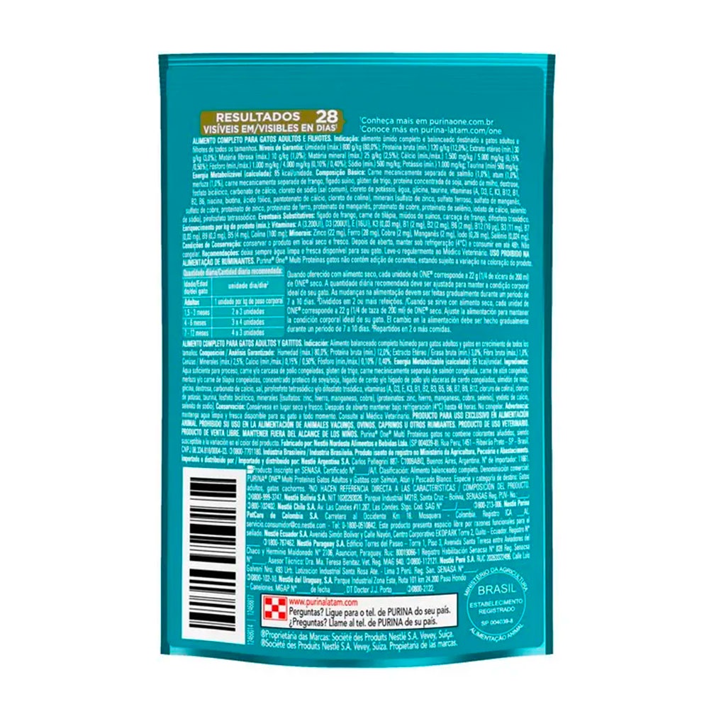 Ração Úmida Purina One Sachê Para Gatos Multi Proteínas 85g - Indicado para gatos; - Alimento com multi proteínas; - Auxilia na saúde da pele e pelagem; - Sabor de Salmão, Atum e Peixe Branco. Purina ONE Gatos Adultos e Filhotes Multi Proteínas é um alimento super premium com multi proteínas que garantem nutrição na medida certa para o seu felino.Promove a saúde dos pelos e pele, sendo visível antes de completar o primeiro mês de uso. Essa ração é indicada para gatos adultos e filhotes. Ingredientes Carne mecanicamente separada de salmão (1,0%), atum (1,0%), merluza (1,0%), carne mecanicamente separada de frango, fígado suíno, glúten de trigo, proteína concentrada de soja, amido de milho, dextrose, fosfato bicálcico, carbonato de cálcio, cloreto de sódio (sal comum), cloreto de potássio, água, glicina, taurina, vitaminas (A, D3, E, K3, B12, B1, B2, B6, niacina, biotina, ácido fólico, pantotenato de cálcio, cloreto de colina), minerais (sulfato de zinco, sulfato ferroso, sulfato de manganês, sulfato de cobre, proteinato de zinco, proteinato de ferro, proteinato de manganês, proteinato de cobre, proteinato de selênio, iodato de cálcio, selenito de sódio), pirofosfato tetrassódico. Eventuais Substitutivos: fígado de frango, carne de tilápia, miúdos de suínos, carcaça de frango, difosfato trissódico