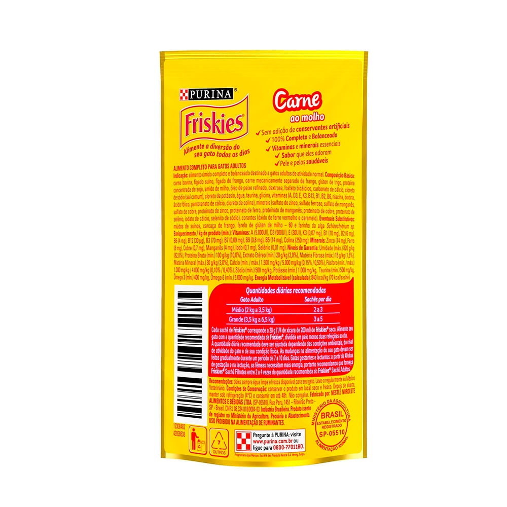 - Indicado para gatos; - Carne ao molho combina ingredientes selecionados em uma deliciosa receita; - Alimento úmido completo e balanceado destinado a gatos adultos de atividade normal; - Pele e pelos saudáveis graças aos níveis adequados de zinco e ácidos graxos essenciais; - Ajuda a manter o seu gato saudável devido à combinação de vitaminas e minerais; A Ração Nestlé Purina Friskies Sachê Carne ao Molho para Gatos é um alimento super saboroso, uma ótima maneira para agradar seu pet. Oferecer ração úmida para gatos ajuda a ampliar o consumo de água mantendo seu pet mais saudável. Composição carne bovina, fígado suíno, fígado de frango, carne mecanicamente separada de frango, glúten de trigo, proteína concentrada de soja, amido de milho, dextrose, fosfato bicálcico, carbonato de cálcio, cloreto de sódio (sal comum), cloreto de potássio, água, taurina, glicina, vitaminas (A, D3, E, K3, B12, mononitrato de tiamina, suplemento de riboflavina, cloridrato de piridoxina, niacina, biotina, ácido fólico, pantotenato de cálcio, cloreto de colina), minerais (sulfato de zinco, proteinato de zinco, sulfato ferroso, sulfato de cobre, proteinato de cobre, sulfato de manganês, proteinato de manganês, iodato de cálcio, selenito de sódio), corantes (óxido de ferro vermelho e caramelo). Eventuais Substitutivos: miúdos de suínos e carcaça de frango.