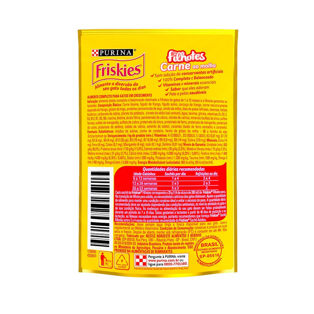 - Indicado para gatos filhotes;- Mix de sabores e texturas deliciosamente surpreendentes; - Pedaços macios e suculentos; - +25%* de proteína; - Alimento 100% completo e balanceado; - Sem adição de conservantes artificiais;FRISKIES Filhotes Carne ao molho é um alimento úmido completo e balanceado destinado a filhotes de gatos de 1 a 12 meses e a fêmeas gestantes ou lactantes. Pele e pelos saudáveis graças aos níveis adequados de zinco e ácidos graxos essenciais. Visão clara e saudável devido à adição de vitamina A e taurina. Formulado com vitaminas e minerais que auxiliam nas defesas naturais. Músculos fortes e saudáveis devido à presença de fontes de proteínas de alta qualidade.Composiçãocarne bovina, fígado suíno, fígado de frango, carne mecanicamente separada de frango, glúten de trigo, proteína concentrada de soja, amido de milho, dextrose, fosfato bicálcico, carbonato de cálcio, cloreto de sódio (sal comum), cloreto de potássio, água, taurina, glicina, vitaminas (A, D3, E, K3, B12, mononitrato de tiamina, suplemento de riboflavina, cloridrato de piridoxina, niacina, biotina, ácido fólico, pantotenato de cálcio, cloreto de colina), minerais (sulfato de zinco, proteinato de zinco, sulfato ferroso, sulfato de cobre, proteinato de cobre, sulfato de manganês, proteinato de manganês, iodato de cálcio, selenito de sódio), corantes (óxido de ferro vermelho e caramelo). Eventuais Substitutivos: miúdos de suínos e carcaça de frango.