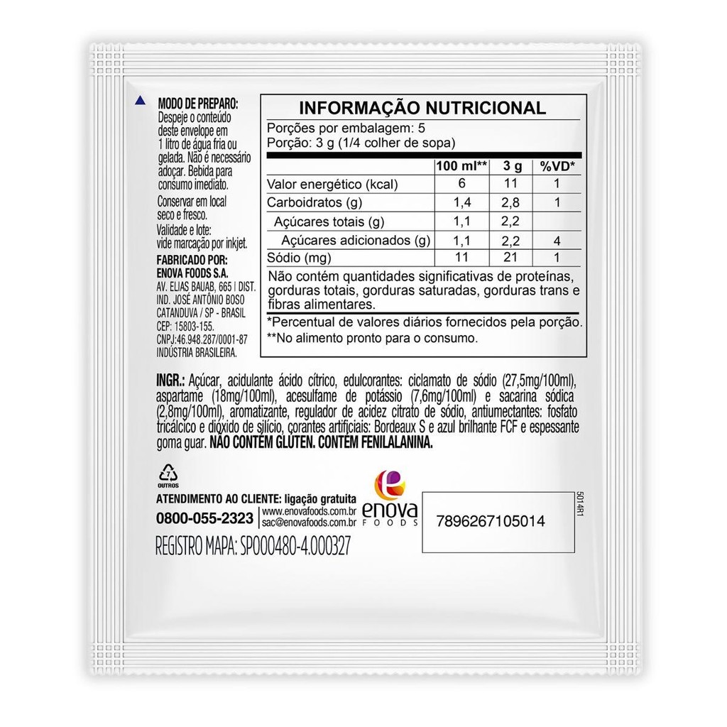 O Ki-Suco Groselha oferece um sabor especial e adocicado, super refrescante e prático para toda a família! – Rende 1 litro! – Gostoso e refrescante. – Com Vitamina C. – Com polpa de fruta. – Embalagem divertida com o jarrão sorridente. – Ótimo custo benefício. Açúcar, vitamina C (ácido ascórbico), suco de groselha desidratado, acidulante ácido cítrico, edulcorantes: ciclamato de sódio (29mg/100ml), aspartame (19mg/100ml), acesulfame de potássio (8mg/100ml) e sacarina sódica (3mg/100ml), aromatizante, regulador de acidez citrato de sódio, antiumectantes: fosfato tricálcico e dióxido de silício, corantes artificiais: Bordeaux S e azul brilhante FCF e espessantes: goma xantana e goma guar. NÃO CONTÉM GLÚTEN. CONTÉM FENILALANINA.