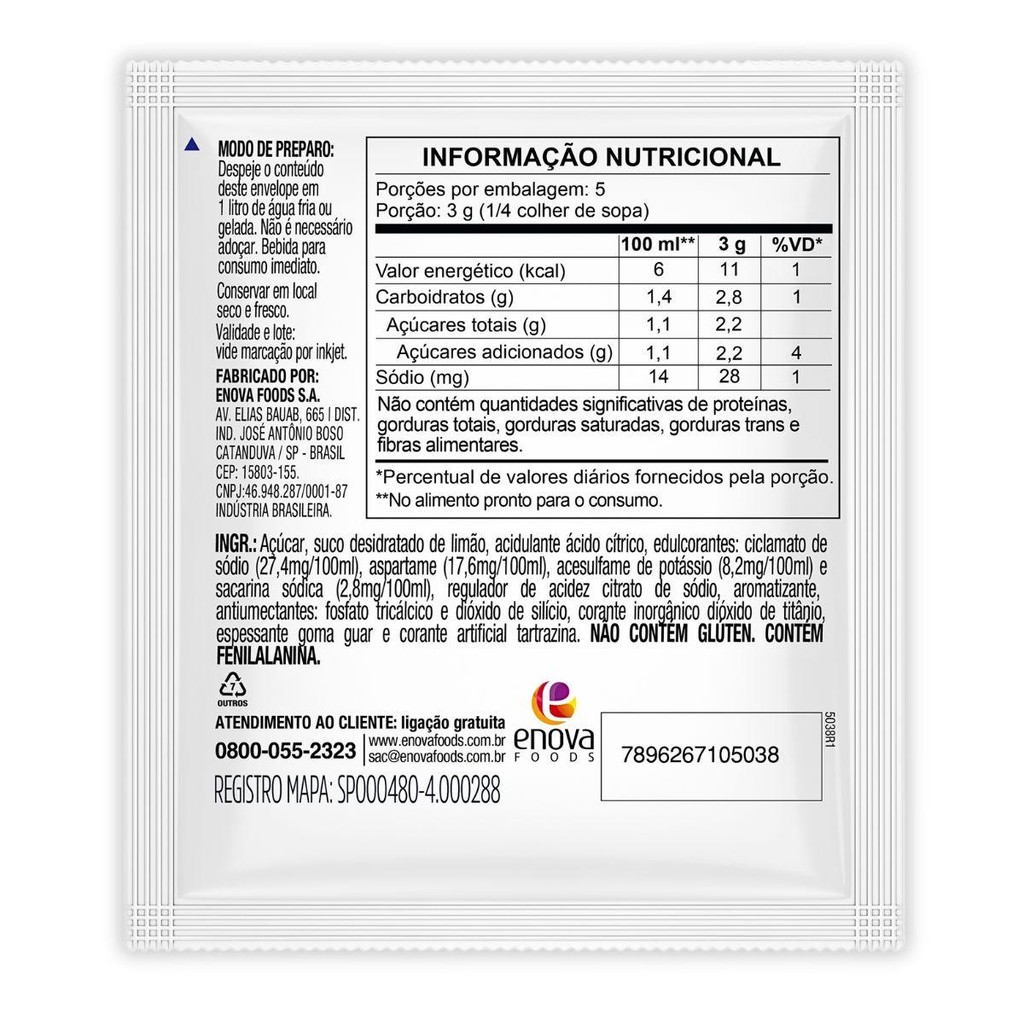 O Ki-Suco Limão oferece um sabor especial e adocicado, super refrescante e prático para toda a família! – Rende 1 litro! – Gostoso e refrescante. – Com Vitamina C. – Com polpa de fruta. – Embalagem divertida com o jarrão sorridente. – Ótimo custo benefício. Açúcar, vitamina C (ácido ascórbico), suco de limão desidratado, acidulante ácido cítrico, edulcorantes: ciclamato de sódio (29,5mg/100ml), aspartame (19mg/100ml), acesulfame de potássio (8,8mg/100ml) e sacarina sódica (3mg/100ml), regulador de acidez citrato de sódio, aromatizante, antiumectantes: fosfato tricálcico e dióxido de silício, corante inorgânico dióxido de titânio, espessantes: goma xantana e goma guar e corante artificial tartrazina. NÃO CONTÉM GLÚTEN. CONTÉM FENILALANINA.