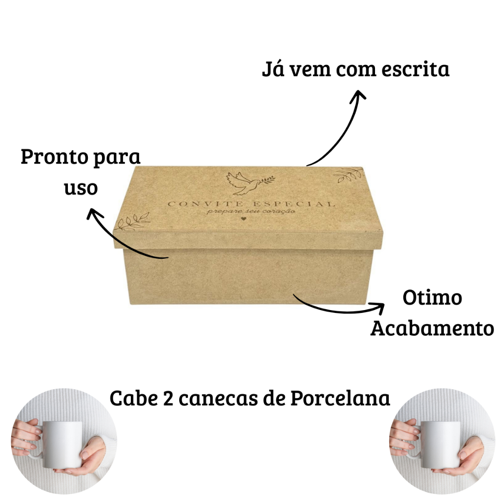 Caixa Porta-Canecas “Você Foi Escolhido” – Convite para Padrinhos Surpreenda seus padrinhos e madrinhas com um convite especial e cheio de significado! Esta linda caixa porta-caneca foi desenvolvida para acomodar perfeitamente uma caneca de porcelana, tornando o momento ainda mais inesquecível. 🪵 Material resistente e acabamento impecável 💬 Já vem com a frase gravada "Você Foi Escolhido" – toque emocional que valoriza o convite 🎁 Pronta para uso – não precisa montar nem personalizar 📏 Medidas: 24 cm (comprimento) x 11 cm (largura) x 10 cm (altura) – ideal para canecas padrão de porcelana 300 ml ✨ Design elegante com detalhes florais – perfeito para ocasiões especiais como casamentos Ideal para quem busca um convite criativo, elegante e funcional. Basta adicionar a caneca personalizada e entregar com carinho!