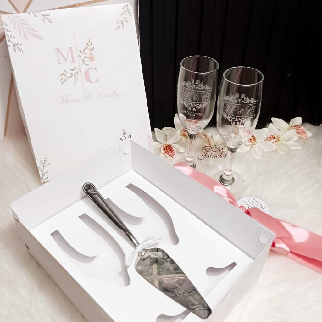 🎁 O KIT CONTÉM: ✔️ 2 taças modelo champagne (vidro de alta qualidade) ✔️ 1 pá de bolo com gravação personalizada ✔️ Caixa decorativa rígida com arte personalizada + laço em cetim ✔️ Personalização com nomes, iniciais e data do evento (ou frase curta) ✨ DETALHES DO PRODUTO: Gravação jateada nas taças e na pá (não sai com lavagens) Caixa com compartimento interno moldado para o encaixe perfeito das peças Embalagem com acabamento delicado e floral – ideal para presentear A arte das fotos é apenas um exemplo – você escolhe como personalizar! 📝 COMO PERSONALIZAR: Após a compra, envie no chat: 🔹 Nomes ou iniciais do casal 🔹 Data do evento 🔹 Frase curta ou detalhes extras (opcional) ⚠️ Enviamos a arte para aprovação antes da produção. 📦 PRAZO DE PRODUÇÃO: 5 dias úteis após a confirmação da arte. 🚚 ENVIO RÁPIDO PARA TODO O BRASIL 💬 Qualquer dúvida, fale com a gente pelo chat! Atendimento humanizado e com carinho 🥰