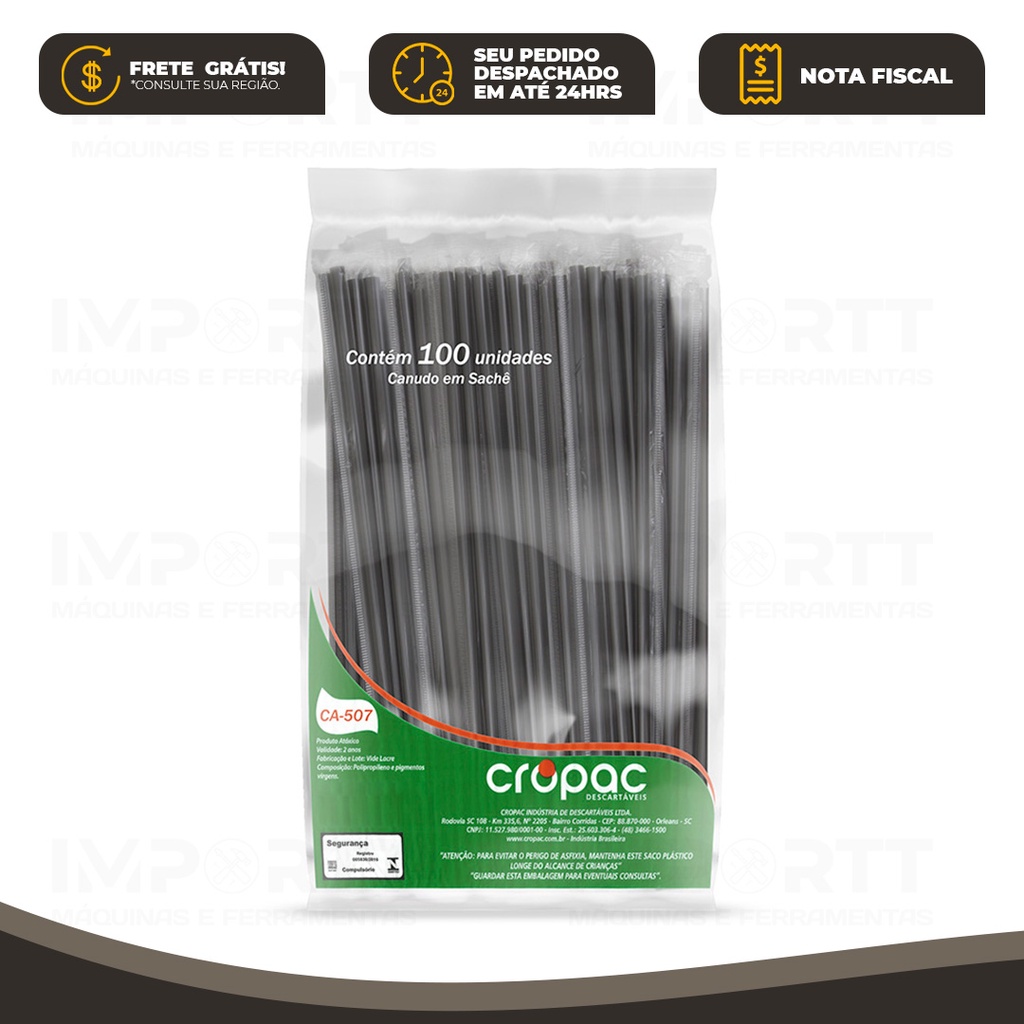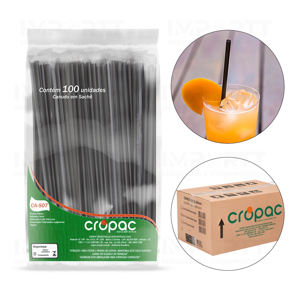 A CROPAC possui uma linha completa em descartáveis, entre copos, copos de festa, canudos tradicional e biodegradável. Produto * Canudo Plástico em Sachê * Contém: 30 Pacotes com 100 Unidades cada - Embalados individualmente * Embalado em cor única * Dimensões: 200mm x 5mm * SKU: CA-507 Descrição: Canudo com sachê (embalado individualmente), garante a higiene da fabricação ao momento do uso. Utilização: Bebidas em geral, Milkshake, Restaurantes