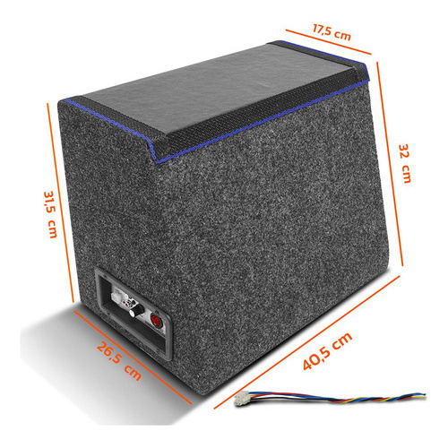 Caixa de Som Trio Shutt Amplificadora 8” 600W RMS Led Neon Carro ***Clientes CNPJ***: As compras realizadas em nome de Pessoa Jurídica estão sujeitas à cobrança de ICMS, conforme Protocolo ICMS 41, de 4 de Abril de 2008. Caso você tenha dúvidas sobre o percentual a ser aplicado, consulte a Cláusula Segunda, 1 do referido Protocolo. Modelo Disponível do Viés: • Viés Italy • Viés França • Viés Alemanha • Viés Prata Fino • Viés Grafite Fino • Viés Amarelo Largo • Viés Amarelo Fino • Viés Azul Largo • Viés Azul Fino • Viés Vermelho Largo • Viés Vermelho Fino OBS: Os modelos que não estiverem disponíveis não aparecerão no botão comprar do anúncio. Especificação Técnica da Caixa: • Modelo Trio Dutado com Divisão • Detalhe de Viés nas Laterais • Fita Led Neon em Seu Contorno para Garantir o Visual Exclusivo ao Projeto de Som • Confeccionada em MDF • Revestimento em Carpete na Laterais e Courvin na Frente e Cima • Coloração Grafite • Excelente Qualidade • Possui Duto de 2 Polegadas • Dimensões Aproximadas (AxCxP inf.xP sup.): 32,5x40,5x26,5x17,5cm Especificação Técnica do Woofer: • Modelo: Woofer Shutt Xplode • Diâmetro Nominal: 8 Polegadas • Potência RMS: 200W • Potência Musical: 400W • Impedância Nominal: 4 Ohms • Resposta de Frequência: 111 a 4.300 Hz • Sensibilidade: 99 Db • Bobina Simples • Carcaça em Chapa de Aço • Diâmetro Aproximado do Ímã: 10 cm • Altura Aproximada do Ímã: 2,5 cm • Dimensões Aproximadas (DxP): 20,5x8cm Especificação Técnica da Placa Amplificadora: • Modelo: XC 200 Trio • Potência RMS: 200W • Impedância de Entrada (Low Input) RCA: 10K Ohms • Impedância de Entrada Convencional: 150 Ohms • Acionamento Remoto Automático Pela Entrada Fio (High Input) • Resposta de Frequência: 40Hz (-3dB) a 15kHz (-3dB) • Tensão de Alimentação: 14,4V (Nominal); 12,0V (Mínimo); 16,0V (Máximo) • Consumo de Corrente: 4,5 Amperes (Máximo) / 100mA (Sem Sinal) Especificação Técnica da Corneta: • Corneta Curta • Fabricada em ABS Injetado de Alta Resistência • Disponível na Cor Preta • Ideal para ser Utilizada com Driver em Caixa Trio • Excelente Acabamento • Diâmetro Aproximado da Abertura da Garganta: 3,5cm • Diâmetro Aproximado do Bocal: 15,5cm • Dimensões Aproximadas (LxAxC): 15,5 x 15,5 x 15,5cm Especificação Técnica do Driver: • Modelo DV-200 • Potência: 100W RMS • Potência Musical: 200W • Impedância: 8 Ohms • Sensibilidade: 104dB • Resposta de Frequência (@ - 10 Db): 600Hz a 8500Hz • Crossover (12dB/Oit) • Reparo: Fenólico • Forma da Bobina: Kapton • Diâmetro x Altura do ímã: 10,2 x 1 cm Especificação Técnica do Super Tweeter: • Modelo TW-200 • Potência: 100W RMS • Potência Musical: 200W • Impedância: 8 Ohms • Sensibilidade (1W@1m): 108dB • Resposta de Frequência (@ - 10 dB): 3500Hz a 20000Hz • Crossover (12dB/Oit) • Reparo: Fenólico • Forma da Bobina: Kapton • Diâmetro x Altura do ímã: 9 x 1 cm Atenção: De acordo com a Lei Federal nº 11.291, a exposição prolongada a ruídos superiores a 85 dB pode causar danos ao sistema auditivo. Conteúdo da Embalagem: • 01 Caixa Trio Dutada • 01 Woofer Xploode • 01 Corneta • 01 Driver • 01 Super Tweeter Importante: Garantia de 3 Meses. Valor do Kit. Imagens Meramente Ilustrativas. Não nos responsabilizamos pelo mau uso do produto.