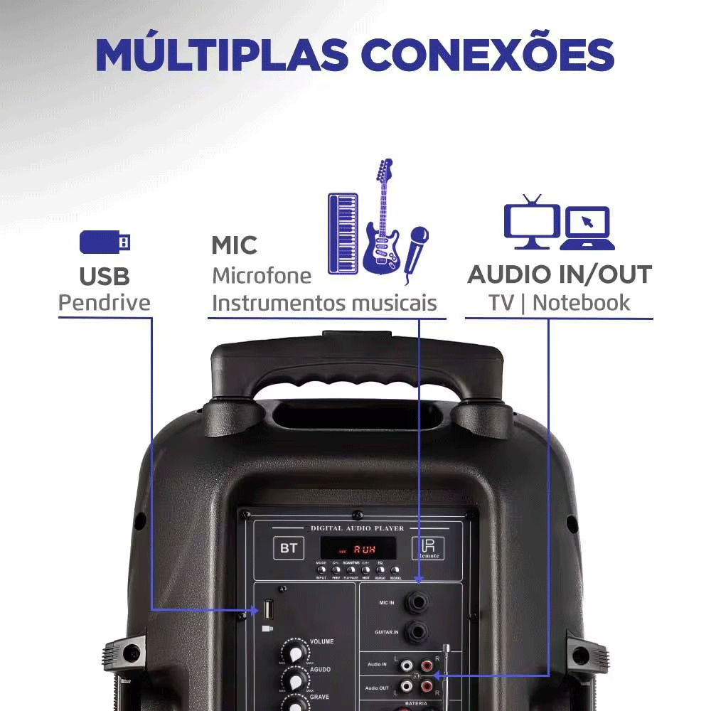 Para aquele encontro com a família ou amigos uma boa música é indispensável, e para a festa ficar completa a Mondial traz a Caixa de Som Amplificada Connect Power Plus CM-550. Trata-se de uma caixa amplificada cheia de recursos para levar o som a todos ambientes e muita diversão aos seus convidados. Possui som potente de 550W e Bluetooth que permite acessar as músicas do seu smartphone, assim a comemoração fica personalizada do jeito que você gosta. Com alças e rodinhas para transporte você poderá levá-la para qualquer lugar. Aproveite a entrada para microfone e guitarra e dê um verdadeiro show. A função TWS permite conectar, via Bluetooth, a outra Caixa Amplificada CM-550, de forma que ambas reproduzam as mesmas faixas de reprodução simultaneamente. Também possui um alto-falante de 12 polegadas e função Flash Light, onde luzes são refletidas no alto-falante para animar ainda mais sua festa. Além disso, possui controle remoto, entrada USB e bateria recarregável porque a música não pode parar. Características: Potência total: 550W Importante: Sempre desligue sua caixa amplificada da tomada de energia elétrica e mantenha a chave POWER na posição DESL. quando ela não estiver em uso e também quando a bateria estiver totalmente carregada. Bateria interna recarregável bivolt Prático e portátil para levar pra onde quiser Display digital e rádio FM Sintonia digital com fácil visualização Flash light Luzes coloridas que piscam e animam qualquer ambiente Alto-falante 12? e 550W RMS Som potente de alta qualidade e performance Bluetooth - Facilidade para ouvir músicas direto do celular sem uso de cabo Função TWS (true wireless stereo) Permite conectar duas caixas CM-550 sem uso de fios Múltiplas conexões (usb/aux/mic/guitar) Entradas para conectar Pen Drive, MP3, MP4, microfone e guitarra Dimensões do Produto: Altura: 57 cm Largura: 37 cm Profundidade: 33 cm Peso: 7,83 kg Conteúdo da embalagem: 1 Caixa Amplificada Mondial 1 Controle Remoto 1 Cabo de Força 1 Cabo RCA/P2 1 Cabo para Bateria Externa Manual de Instruções Garantia do fornecedor: 12 meses Atenção: Verificar voltagem do produto. Fotos meramente ilustrativas. Demais produtos que não fazem parte do conteúdo da embalagem, são ilustrativos e não são vendidos com o produto. Não nos responsabilizamos pela instalação ou montagem; também não nos responsabilizamos pelo transporte por escadas ou elevadores. Todas as instruções, manuais e peças necessárias para a montagem são fornecidas junto com o produto.