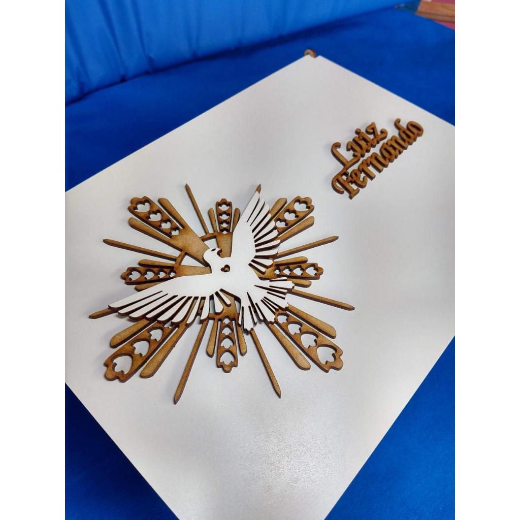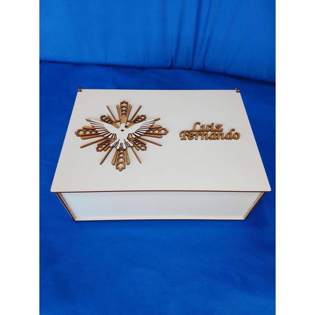 Caixa Batizado 20X28X10 Personalizada, Aplique Espírito Santo e Nome, MDF Branco, Crisma, Batismo, Casamento, Padrinhos