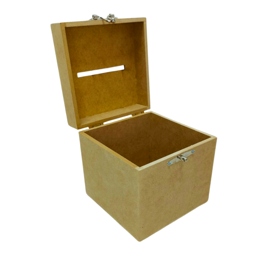 DESCRIÇÃO DO PRODUTO: Cofre em mdf com para fecho cadeado. ( não incluso cadeado) Peça produzida em mdf 6mm e 3mm , pronta para uso ou pintura. Ideal para poupar aquela graninha ou moeda, também ideal para comércios ou feiras de rua. MDF 1ª LINHA. * Madeira MDF de 6mm.- 3mm * Comprimento 15cm * Largura 15cm * Altura 15cm (( medidas externas )) CASO TENHA ALGUMA DÚVIDA, ENVIE SUA PERGUNTA, IREMOS RESPONDER O MAIS RÁPIDO POSSÍVEL.