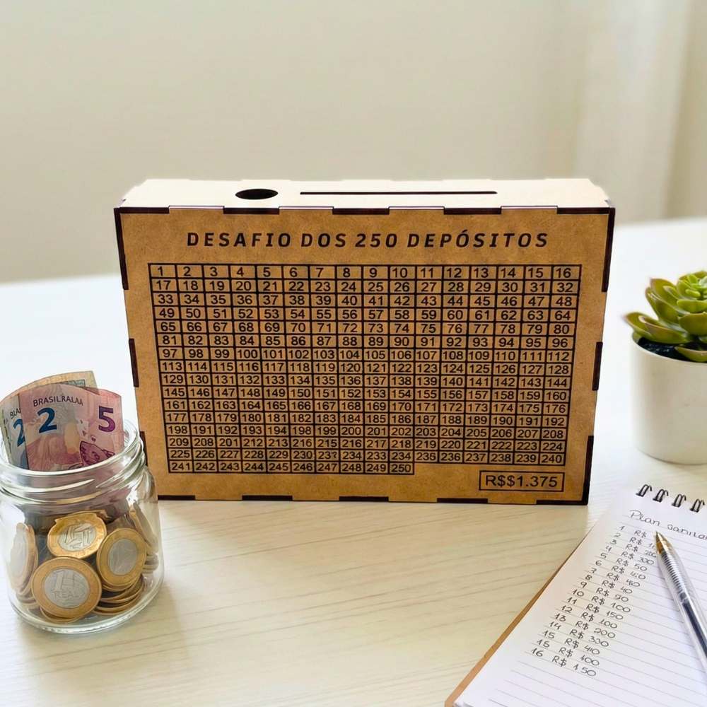 DESCRIÇÃO DO PRODUTO: Transforme suas metas em realidade com o Método Visual de Economia! Poupar dinheiro não precisa ser chato. Com o nosso Kit de Cofres em MDF (Woodbox), você transforma a disciplina financeira em um desafio divertido para fazer em casal, em família ou entre amigos. POR QUE COMPRAR O COMBO? Ao adquirir o kit com 2, 3 ou 4 unidades, você paga mais barato por unidade e cria um sistema de incentivo mútuo. É comprovado: economizar em conjunto aumenta as chances de atingir a meta! IMPORTANTE: ESCOLHA SEU MODELO Selecione a variação desejada no anúncio antes de finalizar a compra. Temos 3 níveis de dificuldade para o seu "Cofrinho": Opção 01: Desafio R$ 5.000,00 – Ideal para quem está começando ou para metas de curto prazo (viagens rápidas, eletrônicos). Opção 02: Desafio R$ 10.000,00 – O nosso campeão de vendas. Perfeito para reservas de emergência ou troca de carro/moto. Opção 03: Desafio 250 Depósitos (Super Meta) – Para quem sonha alto. A soma dos depósitos ultrapassa R$ 31.000,00. COMO FUNCIONA O MÉTODO? Cada Caixa Cofre possui uma tabela numerada gravada na frente. Faça um depósito no cofre. Risque o valor correspondente na tabela. PARA ECONOMIA NO FRETE ENVAIMOS A CAIXA DESMONTADA Acompanhe visualmente o quanto falta para completar sua missão! FICHA TÉCNICA: Material: MDF Cru de alta qualidade (Madeira de reflorestamento). Acabamento: Corte a laser preciso, pronto para uso ou para pintura (artesanato). Tamanho: 22cm x 15cm (Tamanho ideal para decorar estantes e mesas). Sistema: Abertura superior para notas e moedas. O QUE VOCÊ RECEBE: A quantidade de cofres selecionada na variação (Kit com 2, 3 ou 4 unidades). O modelo de desafio escolhido.