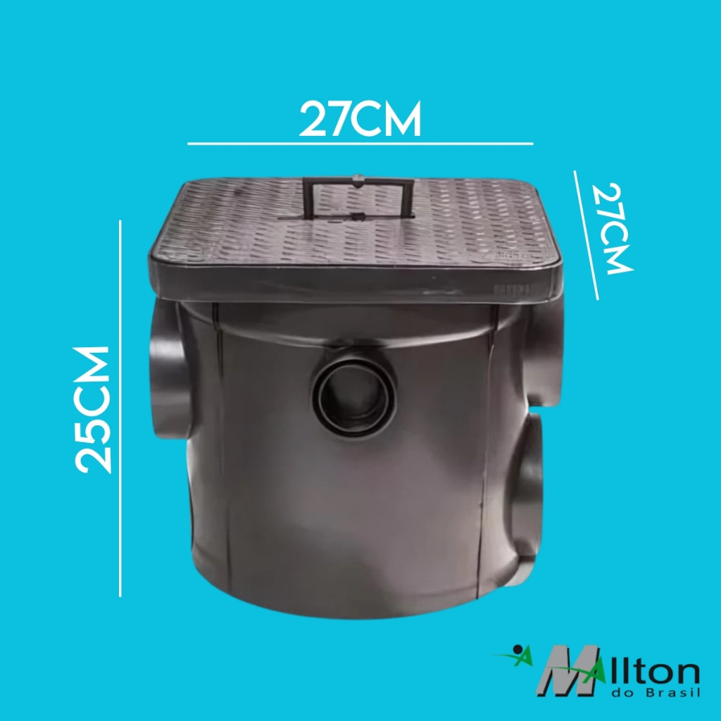 FECHAMENTO HERMÉTICO EVITANDO MAL CHEIRO SISTEMA FUNCIONAL DE FÁCIL INSTALAÇÃO E LIMPEZA ACABAMENTO AJUDA NO ALINHAMENTO COM O PISO FABRICADA NA COR CINZA, MEDINDO 27 x 27 x 25 cm POSSUI 1 SAÍDA DE 75 MM 1 SAÍDA DE 100 MM 3 ESTRADAS DE 40 E 50 MM 1 ENTRADA DE 100
