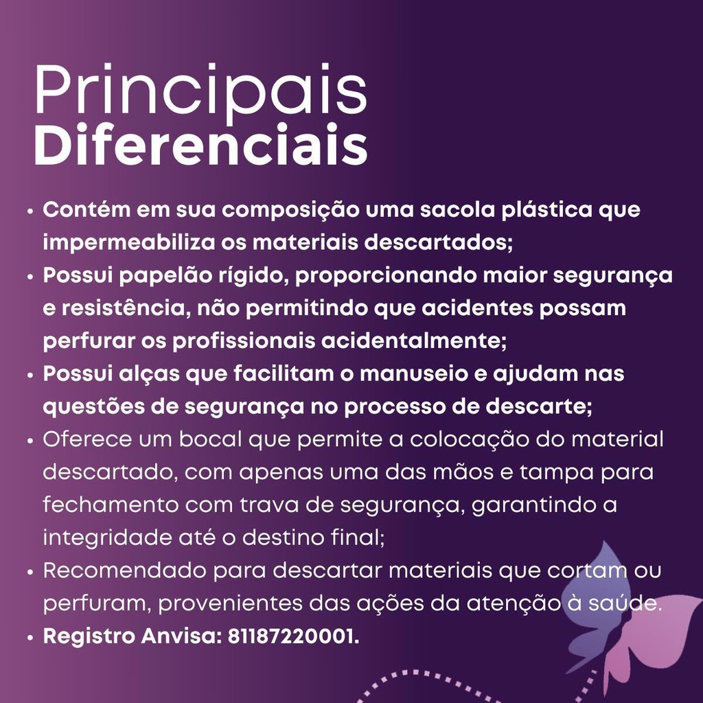 Caixa Coletora Para Material Perfurocortante 7L - Descarpack A Caixa Coletora Descarpack foi especialmente projetada para oferecer máxima segurança em ambientes hospitalares e similares, onde o descarte de resíduos perfurocortantes contaminados é crucial. Por que escolher a Descarpack? - Alta Resistência: Fabricada com papelão ondulado e reforçado internamente com papelão couro, a caixa é robusta e atende rigorosamente às normas da RDC 222/2018 e CONAMA 358. - Design Funcional: A caixa é equipada com uma trava de segurança, alça dupla para fácil transporte e está disponível na cor amarela para fácil identificação. - Descartável e de Uso Único: Desenvolvida para ser usada uma única vez, garantindo a segurança e higiene necessárias. Registro ANVISA: 81187220001. - Dimensões Compactas: Com medidas de Dimensões:207mm X 155mm X 210mm (C x L x A). (C x L x A), é ideal para diferentes ambientes e necessidades. Vantagens da Caixa Coletora Descarpack de 7 Litros A Caixa Coletora Descarpack de 7 Litros foi projetada com uma sacola plástica interna que impermeabiliza o material descartado, assegurando maior segurança. Seu papelão rígido previne perfurações acidentais, protegendo os profissionais de saúde. As alças facilitam o manuseio e contribuem para um processo de descarte seguro. O bocal permite a inserção de materiais descartados com apenas uma das mãos, e a tampa com trava de segurança garante a integridade do conteúdo até o destino final. Indicações de Uso Esta caixa coletora é ideal para o descarte seguro de materiais perfurocortantes em: - Clínicas médicas e de estética; - Casas de saúde e ambulatórios; - Consultórios odontológicos e veterinários; - Hospitais e postos de saúde; - Qualquer ambiente profissional que necessite de descarte apropriado de utensílios perfurocortantes. Modo de Uso: 1 - Preencha a caixa com perfurocortantes até a linha pontilhada. 2 - Não manuseie, reencape ou entorte agulhas usadas. 3 - Para o descarte, feche a tampa com a trava de segurança e transporte a caixa pelas alças, mantendo-a afastada do corpo. 4 - Armazene as caixas coletoras em suportes específicos, fixados a uma altura que permita a visualização interna sem manuseio. 5 - Realize inspeções diárias para verificar as condições de lotação e integridade das caixas. Embalagem Contém: 1 Caixa Coletora de Perfurocortantes Descarpack 7 Litros DÚVIDAS? FAÇA SUA PERGUNTA ABAIXO, SERÁ UM PRAZER LHE ATENDER!