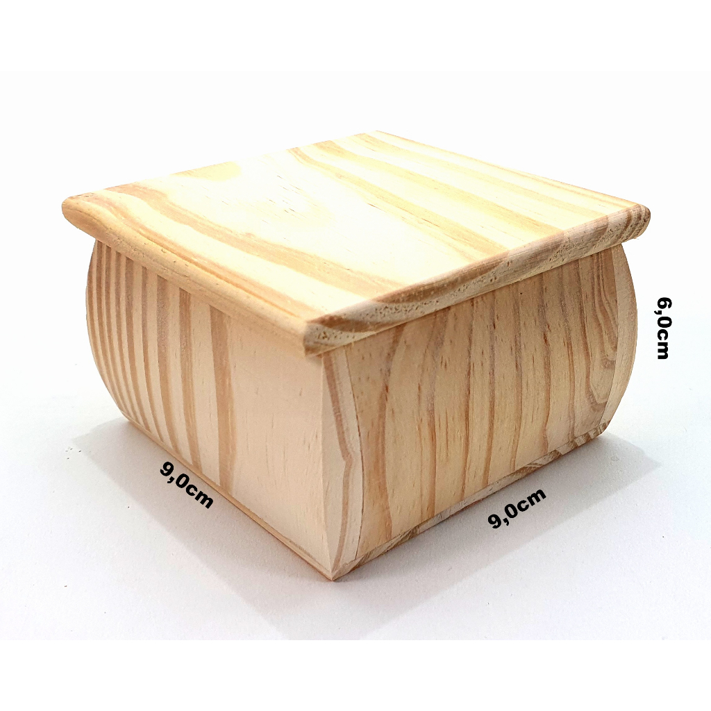 Caixinha Porta Variedades em Madeira Pinus. Peça sem acabamento. Ideal a aplicação de verniz, tinta e etc... Num design clássico e atemporal. Pode ser aplicado para inúmeras ocasiões, como por ex: Lembranças de casamento, organizar bijuterias, bombom... OBS: O tom da madeira pinus bem como as veias/desenho podem variar não seguindo as formas como está na foto do anúncio. O que faz com que cada peça seja única Medida 9cm x 9 cm x 6cm.