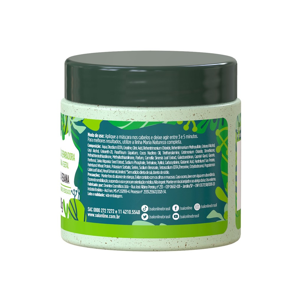 A caixa contém 6 unidades da Máscara de Hidratação Reconstrução Reparadora que ajuda a reconstruir os fios ultra danificados, repara e promove efeito calmante para o couro cabeludo. INDICAÇÕES Para quais tipos de cabelo? Todos os tipos de cabelos. Qual a indicação? Cabelos danificados e ressecados. Pode usar a partir de quantos anos? A partir de 12 anos. ATIVOS Quais os principais ativos? CB2: possui efeito calmante, relaxante e rejuvenescedor para o couro cabeludo. Queratina vegetal: excelente para uma reconstrução capilar profunda, regenera e devolve os nutrientes que o cabelo perde ao longo do tempo. MODO DE USO Qual a melhor forma de usar? Aplique a máscara de hidratação da Salon Line nos cabelos e deixe agir de 3 a 5 minutos. Para melhores resultados, utilize a linha Maria Natureza completa. CARACTERÍSTICAS É produto vegano? O produto é vegano. É liberado? O produto é liberado.