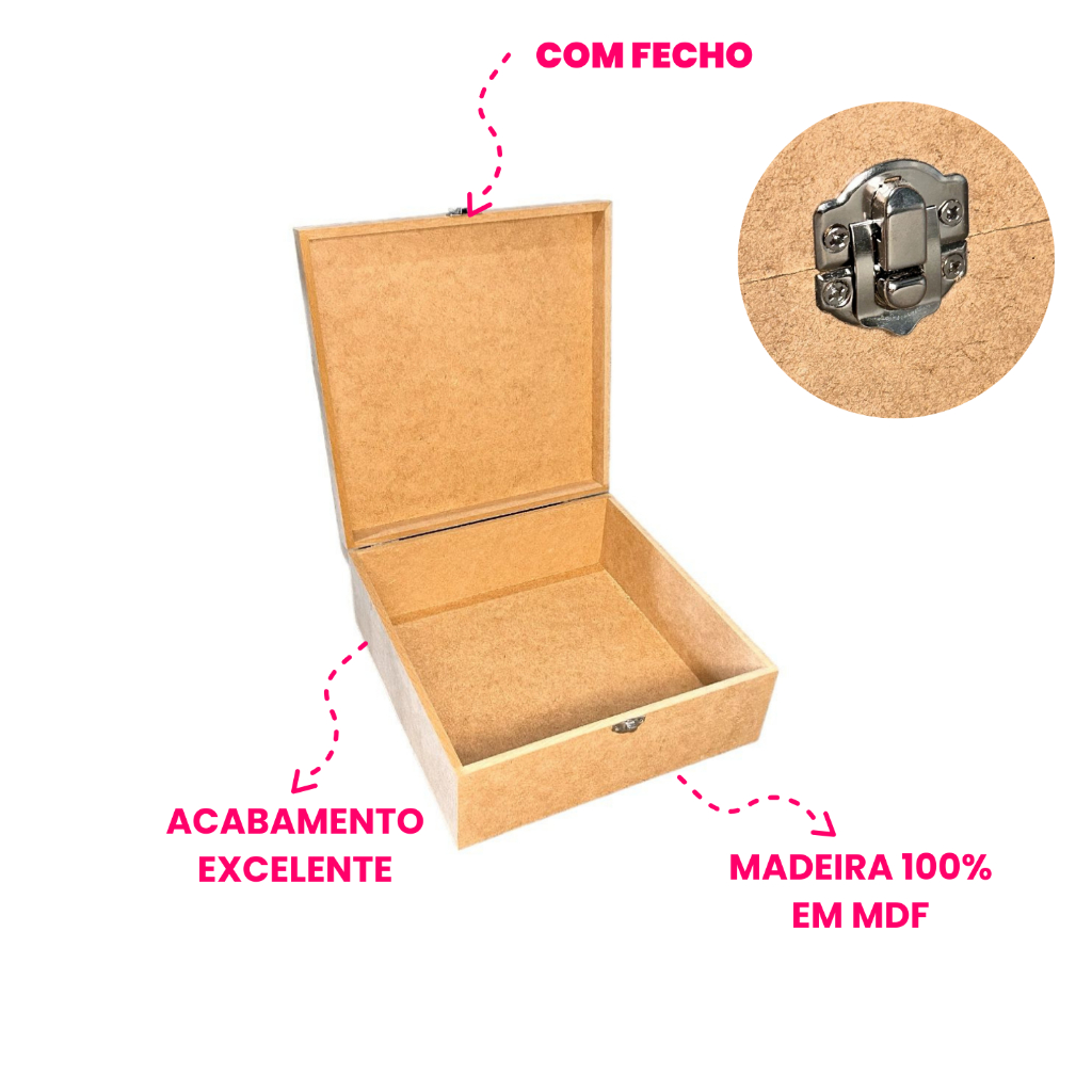 *CAIXA COM FECHO EM MDF CRU 25x25x10* MEDIDAS: Comprimento: 25cm Largura: 25cm Altura: 10cm Produto desenvolvido em Madeira MDF Crua, produzido de forma artesanal com ótimo acabamento. Nossos produtos são entregues, na grande maioria, prontos para decoração. OBSERVAÇÕES: – Nossos produtos são feitos na sua maioria em MDF Crú e todos são enviados sem acabamentos em pintura. – Recomendamos pintar ou fazer algum tipo de acabamento para proteção contra umidade e/ou intempéries. Fundos preparatórios, tintas coloridas ou até mesmo verniz para madeira são boas opções para aumentar a durabilidade dos produtos. – Algumas partes de nossos produtos podem ser enviados desmontados para colagem posterior ao recebimento. Sendo assim, aconselhamos a colagem e/ou montagem antes da pintura, evitando que os encaixes tenham variações e o contato com cola seja diretamente com a pintura, diminuindo a aderência. Qualquer duvida estamos a disposição!! Aguardamos seu pedido.