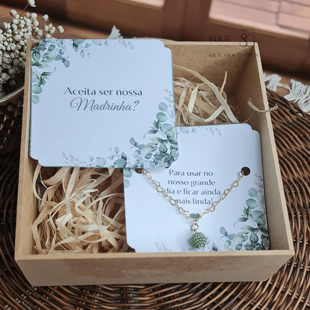 Opção somente a CAIXA - Contém caixa com tampa decorada e laço decorado com flores secas e lacre de cera (não acompanha palha). Opção Caixa Completa - Pulseira folhada corrente de elo de coração e com pingente da cor escolhida e TAG, Caixa com tampa decorada como na imagem do anuncio e laço decorado com flores secas e lacre de cera, Tag convite em papel texturizado, acompanha palha no fundo da caixa. Kit prático e que junta o custo benefício e beleza na hora de presentear sua madrinha de casamento. Atenção - Itens não são personalizados (artes e temas enviadas idênticas ás imagens do anuncio) - Caixa em MDF 15x15x6 (tampa decorada não personalizada, item enviado idêntico a foto do anuncio) - Dependendo do dispositivo utilizado para visualizar as imagens pode sofrer leve alteração de tons. Para dúvidas nos mande uma mensagem, ficaremos felizes em atende-lo!