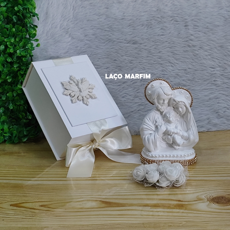 ATENÇÃO O ENVIO SÃO DIAS ÚTEIS + PRAZO DOS CORREIOS Presenteie com fé e delicadeza! Nossa Caixa para Padrinhos de Batismo é produzida artesanalmente em cartonagem rígida, com acabamento fino e detalhes que encantam. Uma forma única de eternizar esse momento tão especial. 📦 O que acompanha: * 1 Caixa rígida personalizada (cartonagem) * 1 Imagem da Sagrada Família com 14 cm, com aplicação de strass e pérola * 1 Mensagem interna na tampa * Fita personalizada (cor pode ser escolhida) 📐 Tamanho da caixa: 10x15x6,5 cm 🎨 Personalização da fita: Sim (você escolhe a cor) ⚠️ Importante: * Por se tratar de um produto artesanal, podem ocorrer pequenas variações. * As cores podem apresentar diferenças conforme a iluminação da foto ou tela do seu dispositivo. Boa compra!!!!