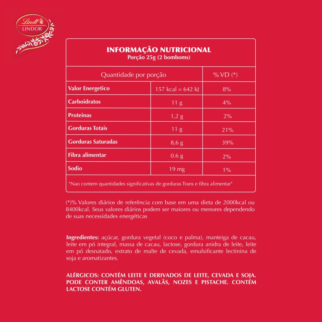 | Caixa de Bombons Lindt Lindor ao Leite 37g este produto | R$ 19,99 | — | 4.5/5 | — |