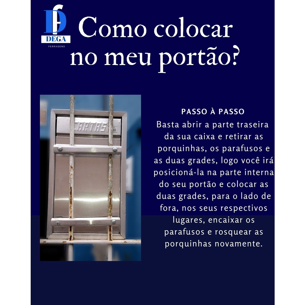 POR FAVOR, LEIA A DESCRIÇÃO ATENTAMENTE!! Caixa correio chapa de aço portão grade ou embutir em parede ou muro 0.50mm. Para grande quantidade de cartas encomendas e documentos em geral, essa é a sua solução! Pintura eletrostática. Cor AMARELA moderna, que facilita a visibilidade na hora de entregar as suas correspondências. Caixa com profundidade em tamanho maior, COM TRINCO, PARA MANTÊ-LA FECHADA E ENTRADA PARA CADEADO (NÃO INCLUSO) ASSIM PODE, OBTER UMA MAIOR SEGURANÇA DE SUAS CORRESPONDÊNCIAS E DOCUMENTOS EM GERAL, evitando assim que a caixa fique aberta e suas correspondências e mercadorias se molhem ou caiam no chão, extraviem etc... Contém quatro parafusos e quatro porcas para maior estabilidade ao portão, sendo eles sem fenda, para garantir maior segurança ao seu produto a porta abre para o lado de dentro da residência. ( 3 meses de garantia). Largura: 23 cm Altura: 38,5 cm Profundidade: 15 cm Dega Ferragens, requinte e qualidade para o seu lar! Imagem meramente ilustrativa. Após a confirmação do pagamento, entregamos em 24hrs ao CENTRO DE DISTRIBUIÇÃO SHOPPE, exceto sábado, domingo e feriados.