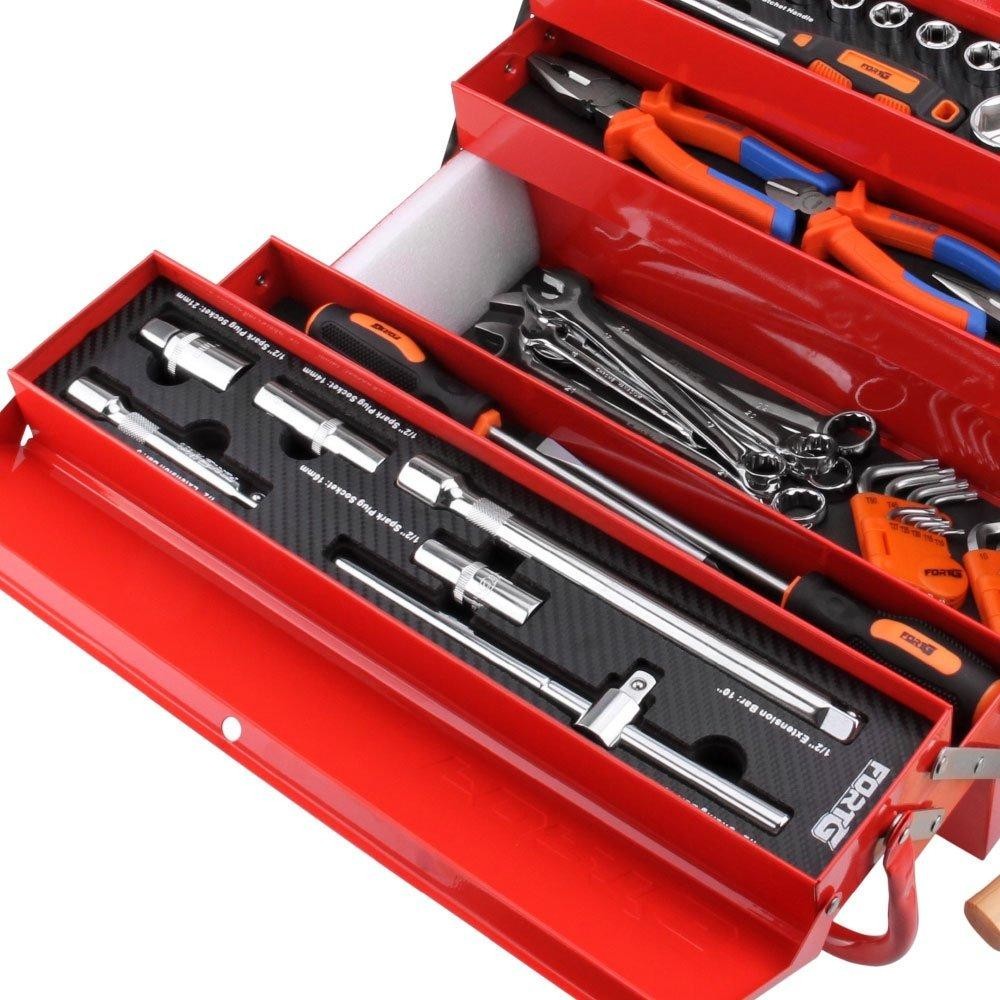 Kit completo de ferramentas FG6101, para você que precisa começar ou completar suas ferramentas nada melhor que uma Caixa de Ferramentas completa com 68 ferramentas em aço cromo vanádio. -Características: :: Caixa Sanfonada, Dimensões: - Fechada: 47.7x20.7x21.7cm - Aberta: 47.7x67.5x22cm :: Alça: 22x10cm :: Nichos: - Menores: 9.5x4cm - Maior: 20x10cm :: Peso suportado: 10kg :: Peso: 4.6kg :: Espessura: 0.6mm :: Material: - Corpo em Aço - Pintura Eletroestática - EVA em todos os nichos - Acompanha 68 peças, sendo elas : :: 1 Alicate Universal 8" :: 1 Alicate de Corte 6” :: 1 Alicate de Bico meia cana 6” :: 1 Chave de Catraca Reversível 10", em cromo vanádio (CR-V) :: 3 Chave de Fenda, tamanhos: 5.5x100 mm, 6.5x150mm, 8x175mm :: 3 Chave de Fenda Cruzada, tamanhos: Ph1x80mm, PH2x100mm, PH3x150mm :: 13 Chaves Combinadas, tamanhos: 10, 11, 12, 13, 14, 15, 16, 17, 18, 19, 20, 21, 22mm, em cromo vanádio (CR-V) :: 9 Chaves Hexagonais Curtas, tamanhos: 1.5, 2, 2.5, 3, 4, 5, 6, 8, 10mm, em cromo vanádio (CR-V) :: 9 Chaves Torks, tamanhos: T10, T15, T20, T25, T27, T27, T30, T40, T45, T50, em cromo vanádio (CR-V) :: 18 Soquetes 1/2", tamanhos: 10, 11, 12, 13, 14, 15, 16, 17, 18, 19, 20, 21, 22, 23, 24, 27, 30, 32mm, em cromo vanádio (CR-V) :: 2 Barra extensora 5 e 10", em cromo vanádio (CR-V) :: 1 Cabo T de 1/2", em cromo vanádio (CR-V) :: 3 Soquetes vela de ignição, tamanhos: 14, 16, 21mm, em cromo vanádio (CR-V) :: 1 Martelo de Bola 500g :: 1 Alicate de Pressão 10", em cromo vanádio (CR-V) :: 1 Caixa de metal com 5 bandejas - Garantia: 6 Meses Ref.: FORTGPRO-FG6101 Marca.: FORTGPRO